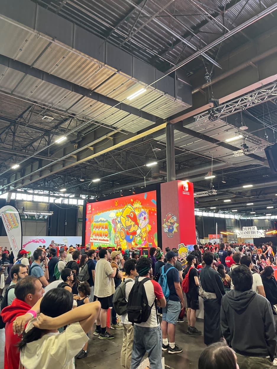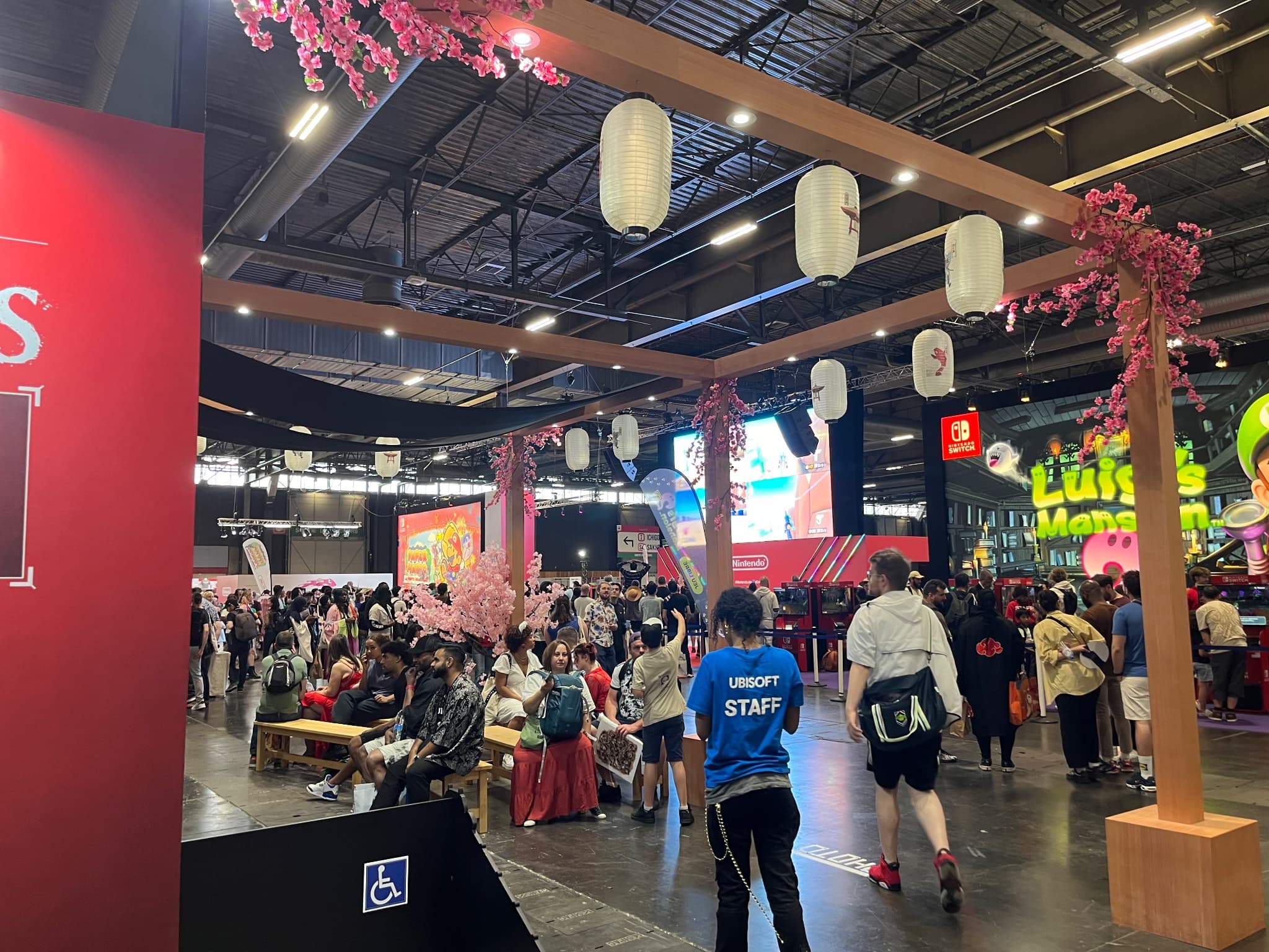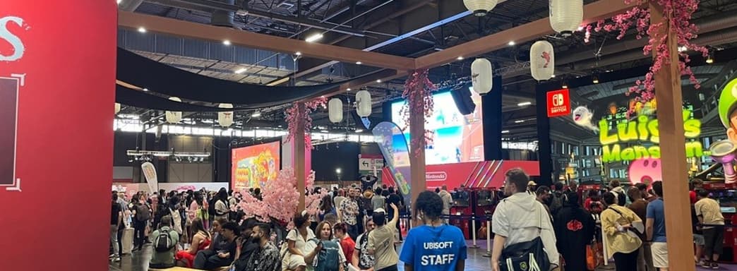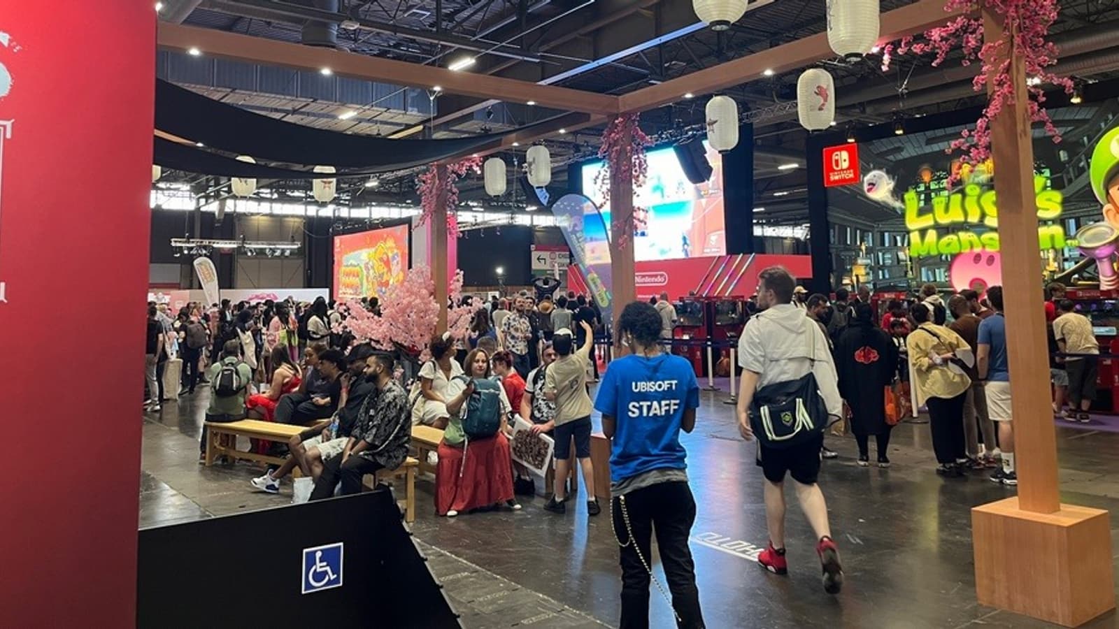 Сообщается, что люди занимали скамейки у стенда Ubisoft, чтобы смотреть на экран с играми Nintendo напротив.