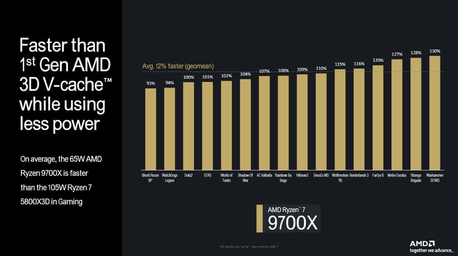 Конечно, новенький Ryzen 7 9700X превосходит по чистой производительности игровой флагман, но разница составляет в среднем 2%, если верить заявлениям компании. Напоминаем, что подтвержденных «живых» тестов от пользователей пока нет.