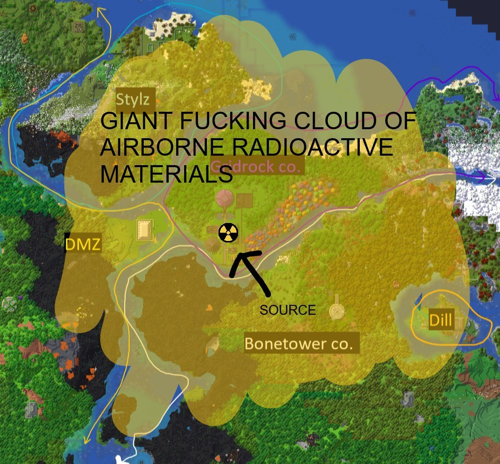 Карта получившихся «ядерных осадков» в Minecraft выглядит следующим образом. Если игрок заглянет в такую облучённую область, то попросту погибнет — она непригодна для жизни (область останется такой на несколько часов)..