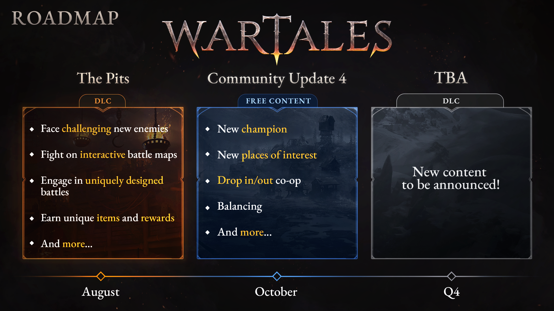 На октябрь для Wartales готовят бесплатный контент: новый чемпион, дополнительные точки интереса, будет реализована функция кооператива с возможностью входа/выхода в любое время (система drop in / out), также обещают правки баланса и другие изменения.