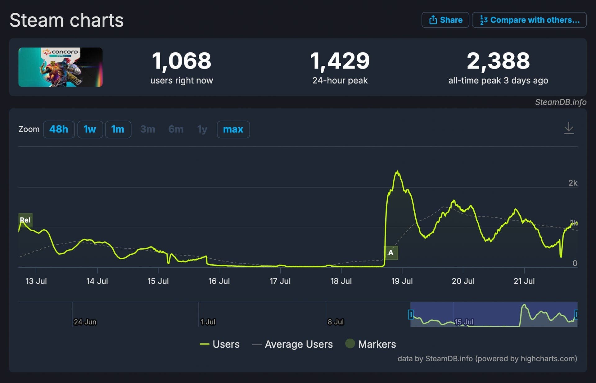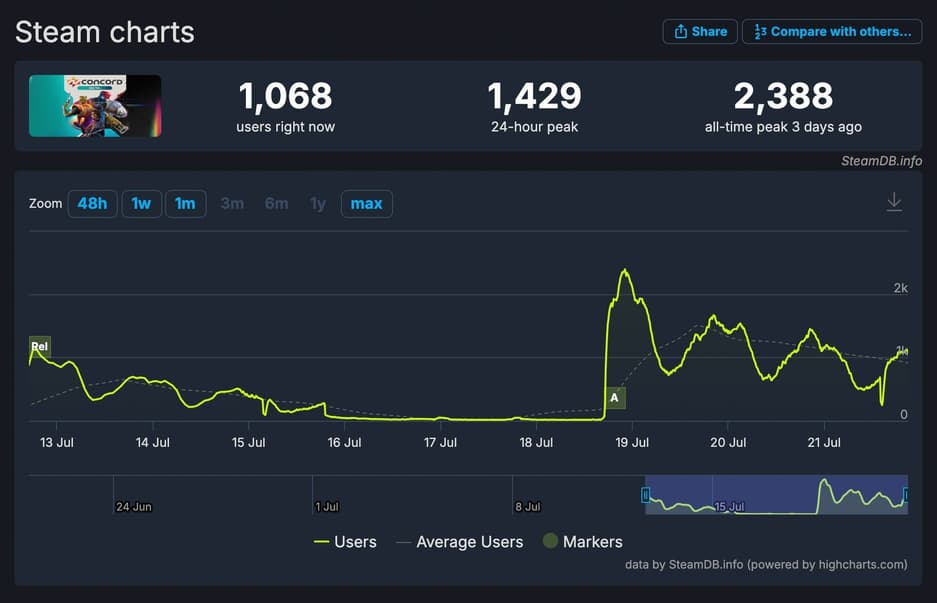 По данным SteamDB, в открытой бете Concord зарегистрировано менее 2,4 тысячи одновременных игроков, что стало максимальным показателем в эти дни. За последние 24 часа она не достигла даже 1,5 тысячи одновременных игроков.