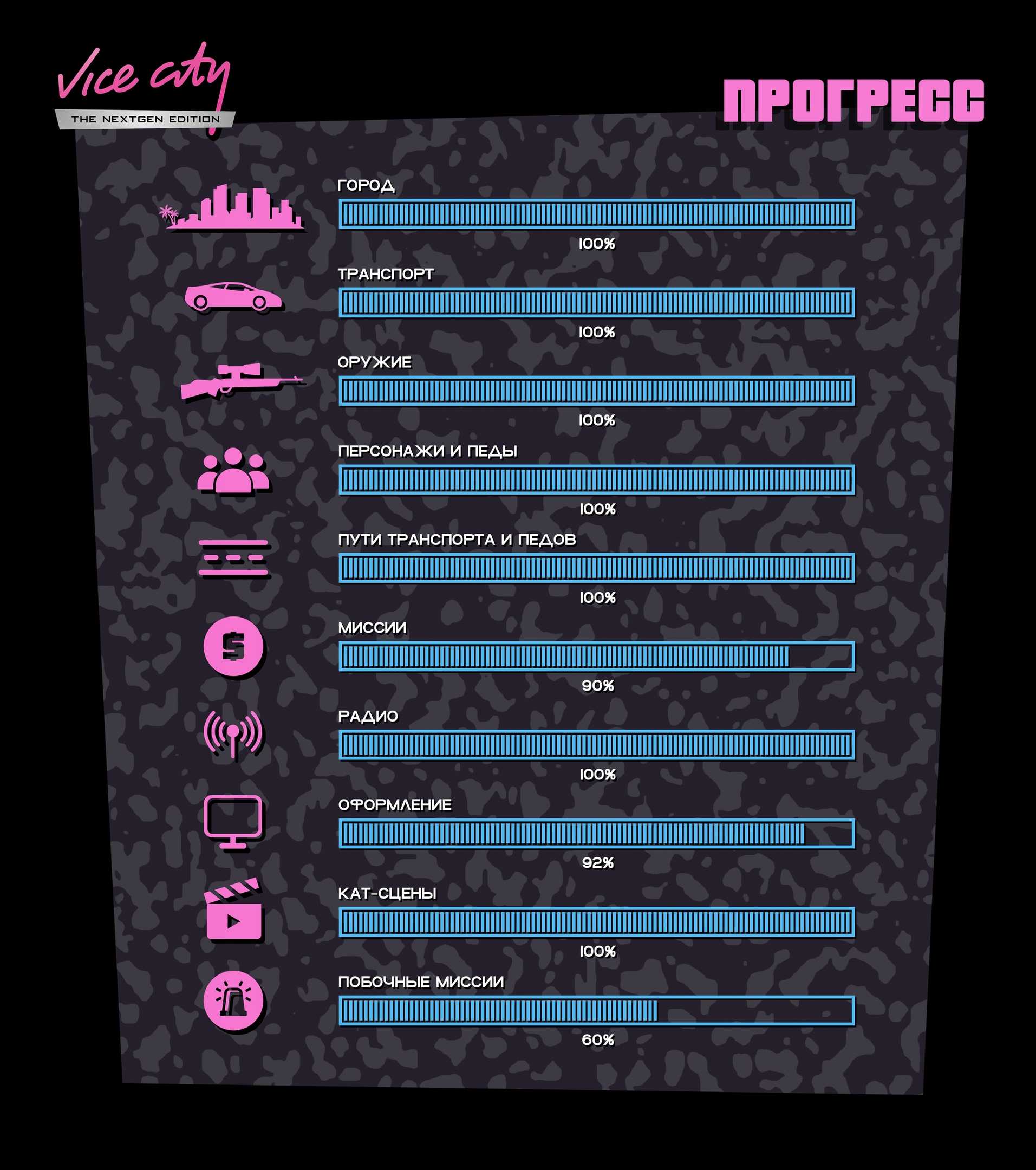 Вот так выглядит график прогресса работы над GTA Vice City Nextgen Edition по состоянию на 23 июля 2024 года.