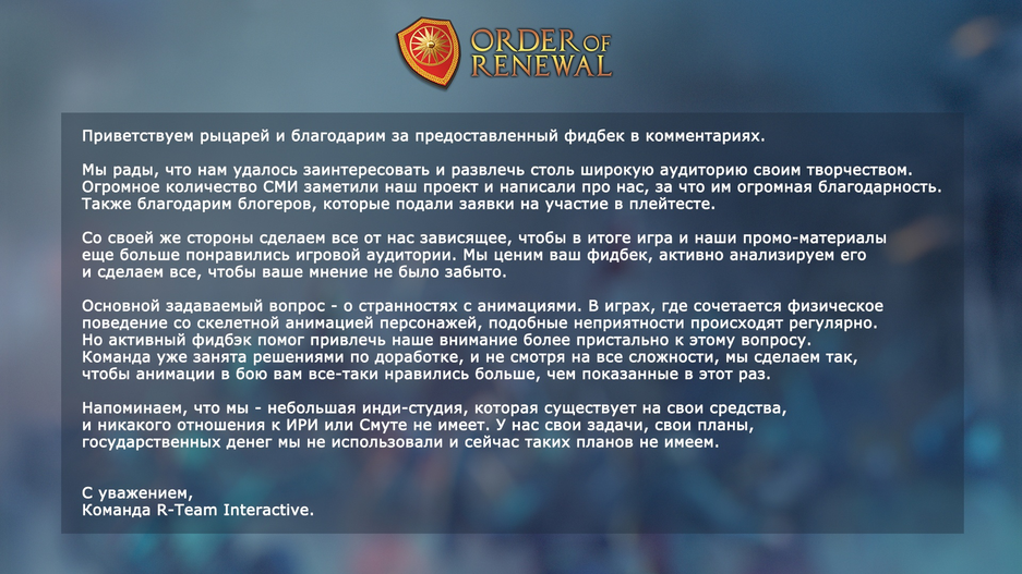 Авторы Order of Renewal решили обозначить свою позицию — отзывы слышат и делают выводы, команда уже занимается доработкой анимаций: