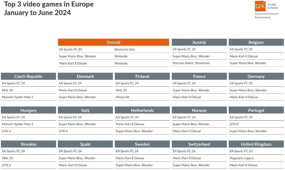 Компания GfK Entertainment опубликовала список из трех самых продаваемых игр в семнадцати европейских странах. Видно, что геймеры часто выбирают похожие игры, но есть одна, которая возглавляет все рейтинги. Стоит отметить, что данные собраны с января по июнь 2024 года и включают только физические продажи.