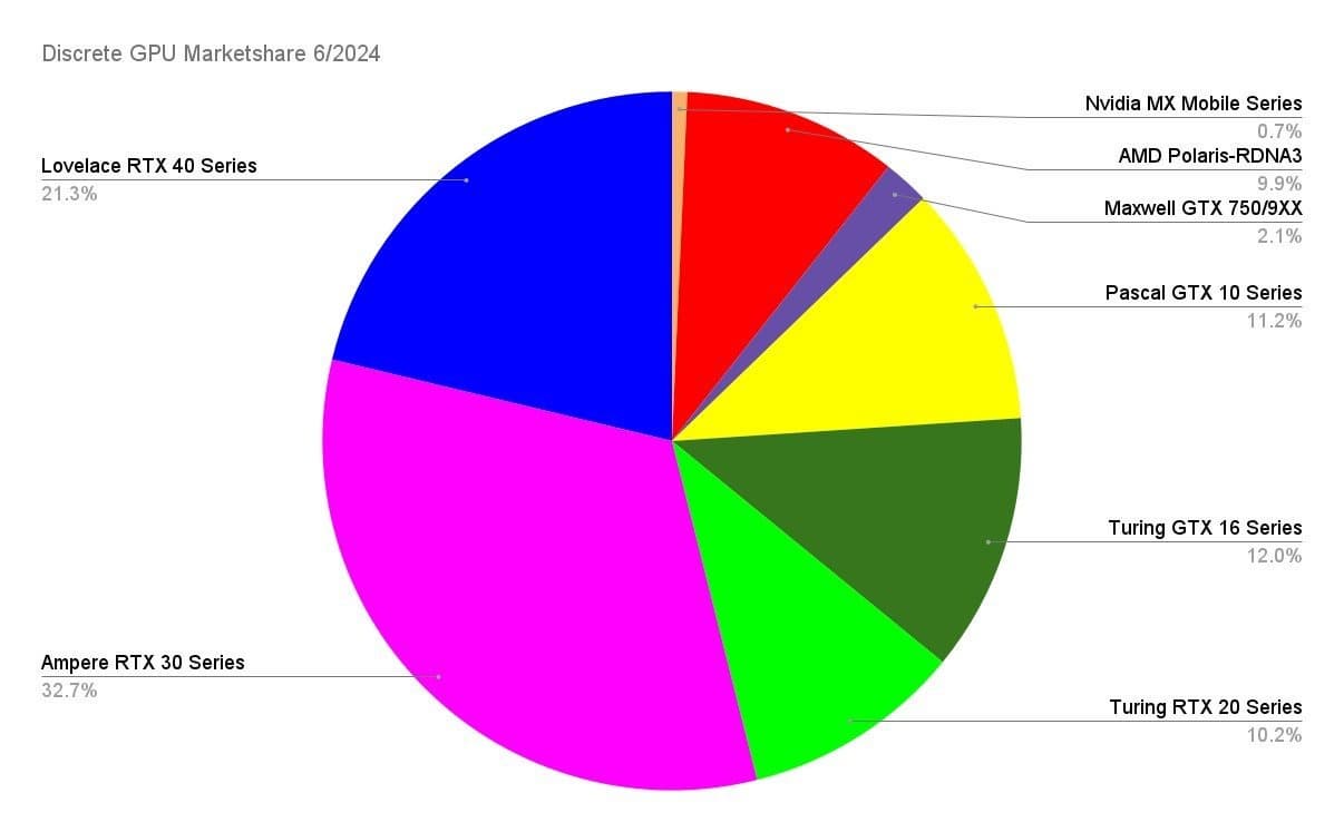 В данных, которые относятся к июню 2024 года, показывается, насколько сильно NVIDIA доминирует над конкурентами. График раскрывает ещё несколько интересных фактов. Последние графические процессоры семейства GeForce RTX 40 занимают 21,3% доли рынка. Предыдущие графические процессоры семейства «Ampere», RTX 30, занимают 32,7% рынка. Более старые видеокарты семейства Turing, или RTX 20, занимают 22,2%.В отличие от них, некогда доминировавшие графические процессоры серии GTX 16 упали до 12%.Очевидно, геймеры обновляют свои устройства.