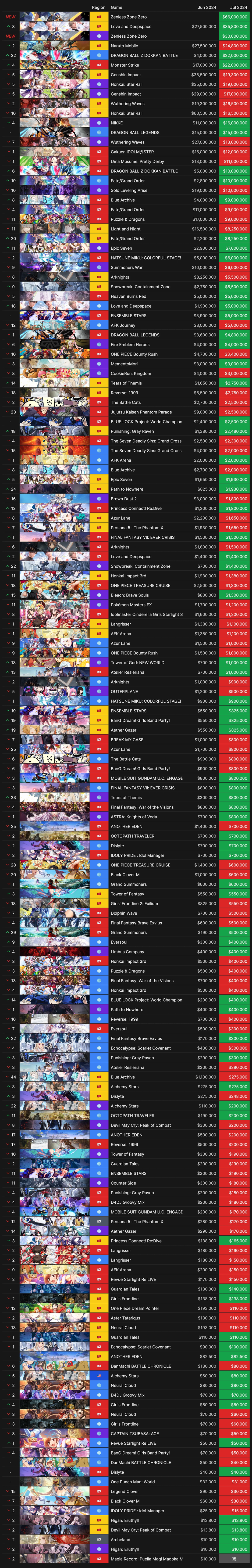 У других игр miHoYo, Genshin Impact и Honkai Star Rail, дела обстоят похуже. У Genshin выручка снизилась с $67.5 миллиона в июне до $36.3 миллиона в июле, а в случае с HSR падение с $95.5 в июне до $35.5 миллиона в июле.