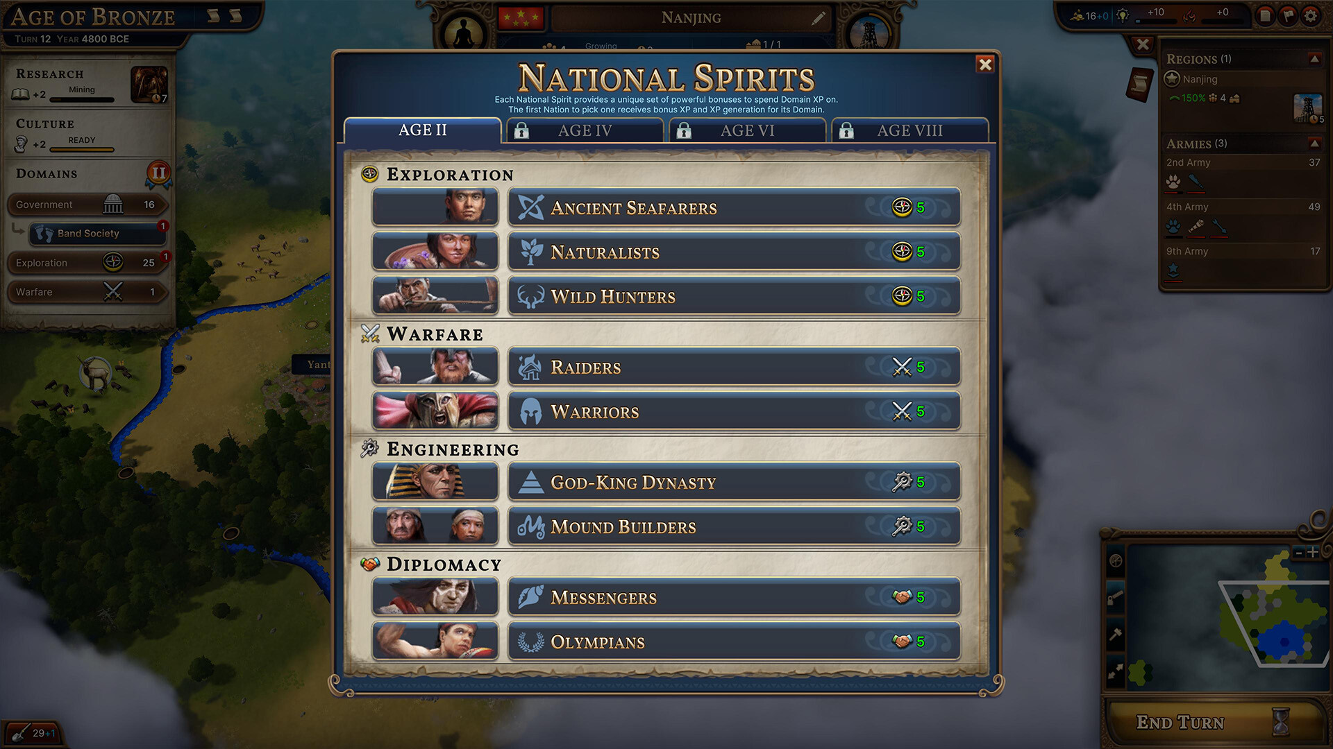 - Новый национальный дух: «национальный дух "Посланник", доступный с эпохи II, позволяет сделать упор на дипломатию на ранних этапах игры. Дарите подарки вождям враждебных племен, забирайте полезные ресурсы у малых народов и помогайте им сохранять независимость, извлекайте пользу из лам — вашего нового особого ресурса».