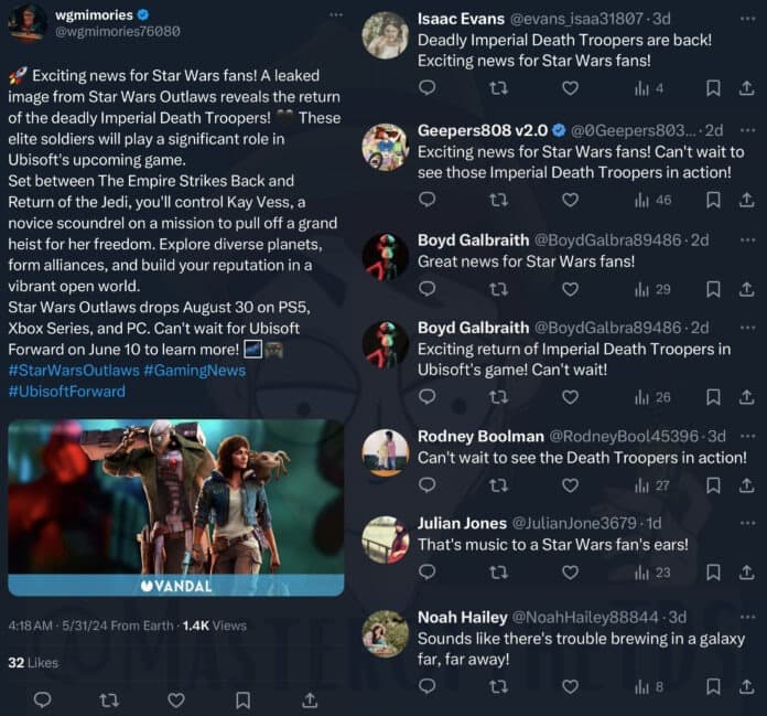 Пользователь сети X поделился множеством комментариев к постам Star Wars Outlaws, большинство из которых делают боты.