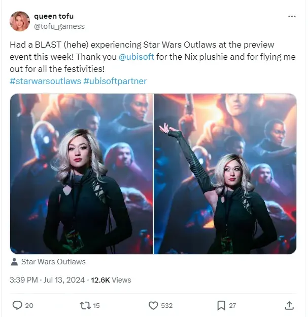 «Очень понравилось (хе-хе) играть в Star Wars Outlaws! Спасибо Ubisoft за плюшевого Никса и за то, что организовали для меня эти гуляния!», — пишет Tofu_gamess.
