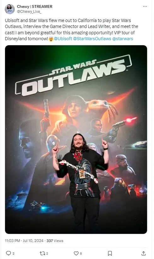 «Ubisoft и Star Wars отправили меня в Калифорнию, чтобы я поиграл в Star Wars Outlaws, взял интервью у геймдиректора и ведущего сценариста, а также встретился с актерами! Я безмерно благодарен за эту возможность. Завтра VIP-тур по "Диснейленду"!», — пишет Chewy.