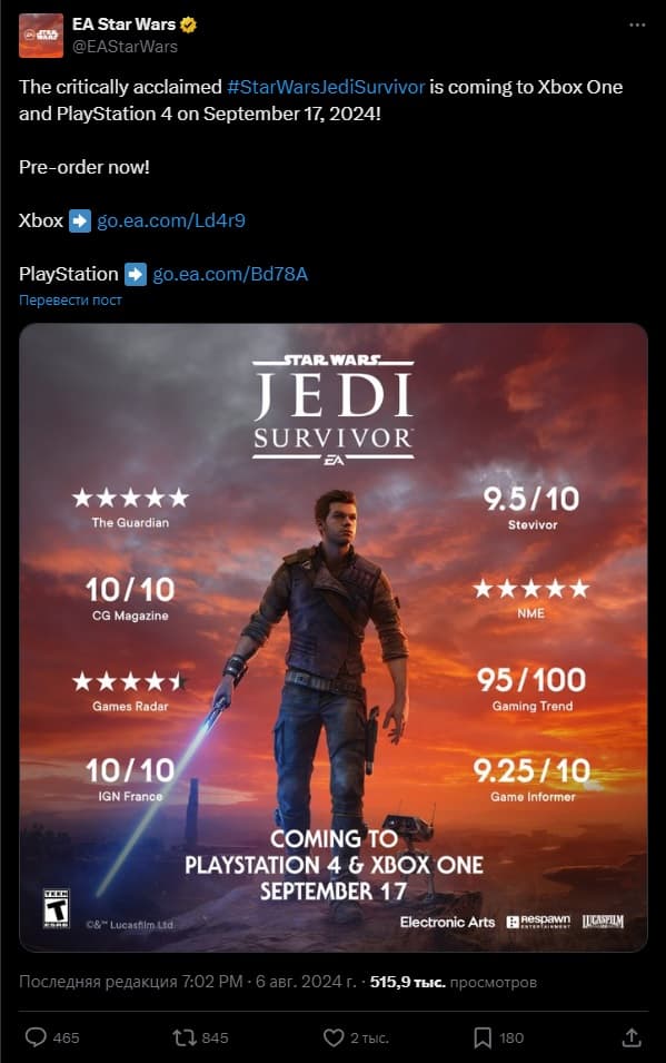 Star Wars Jedi: Survivor в апреле 2023 года вышла на ПК, PS5, Xbox Series X|S, понравилась критикам и геймерам подходом к повествованию, геймплею и высококачественной графикой. Версия для PlayStation 4 и Xbox One позволит расширить аудиторию приключения во вселенной «Звездных войн».