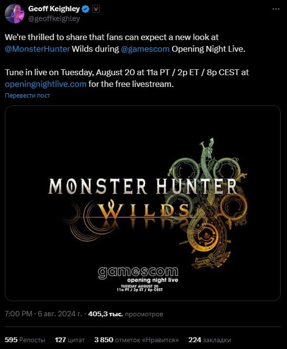 Джефф Кейли подтвердил в сети X, что новые геймплейные кадры из Monster Hunter: Wilds покажут на открытии мероприятия Gamescom 2024. На данный момент неизвестно, будет ли это ещё один трейлер или геймплейные кадры.