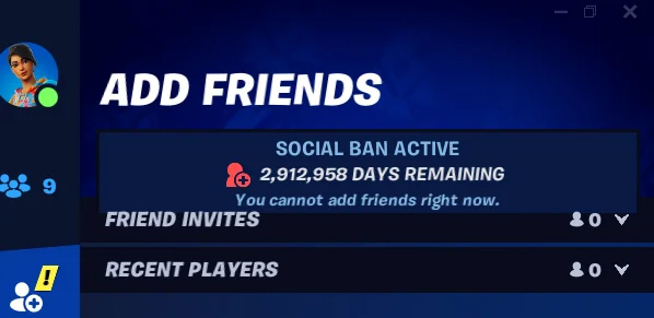 Иногда в Fortnite пользователи могут получить наказание за некорректное поведение: ругательства в чате, оскорбительное имя пользователя, создание пользовательских карт с «сомнительным подтекстом» и т.д. В качестве наказания накладывают «социальный бан» — лишают права использовать головой и текстовый чат, возможности добавлять в друзья.