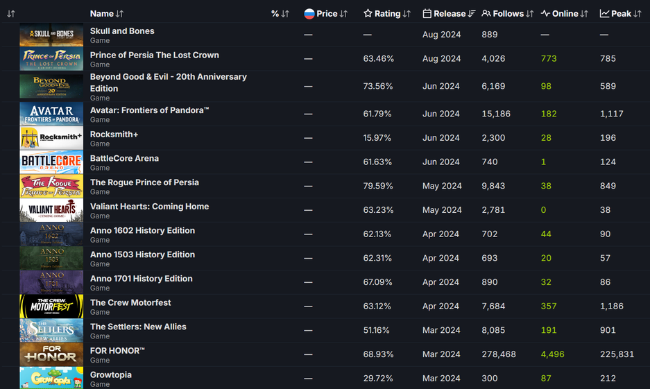 Однако это всё же неплохой результат для релизов современной Ubisfot — другая игра по франшизе The Rogue Prince of Persia от авторов знаменитой Dead Cells показала результат лишь чуть больше, чем Prince of Persia The Lost Crown. Игра по «Аватару» тоже не сильно вырвалась вперёд в плане онлайна.