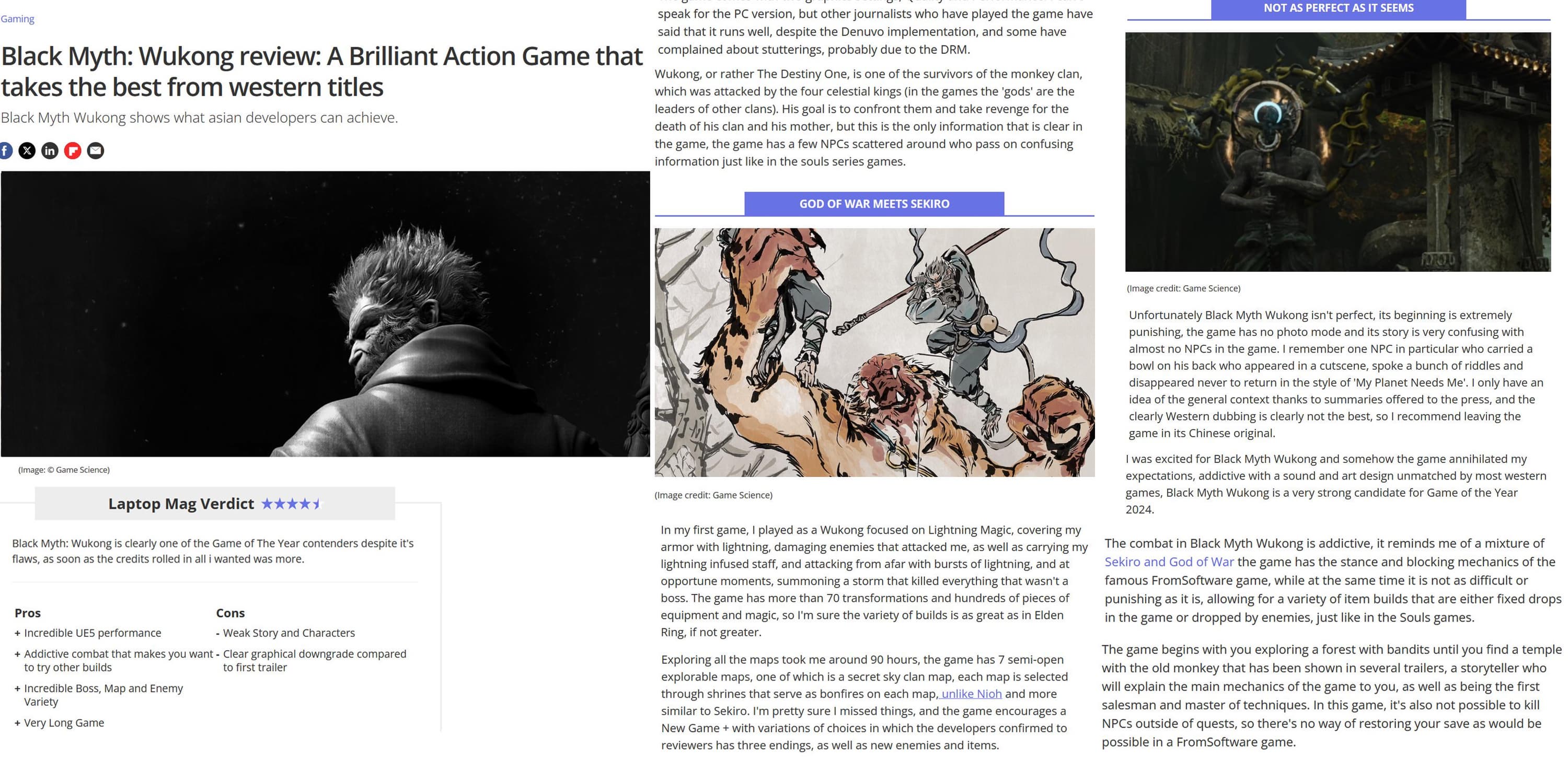 В сеть попал первый обзор боевика с ролевыми элементами Black Myth: Wukong. Издание Laptop Mag, похоже, заранее его опубликовала, а затем убрала, поэтому скриншот попал в сеть.