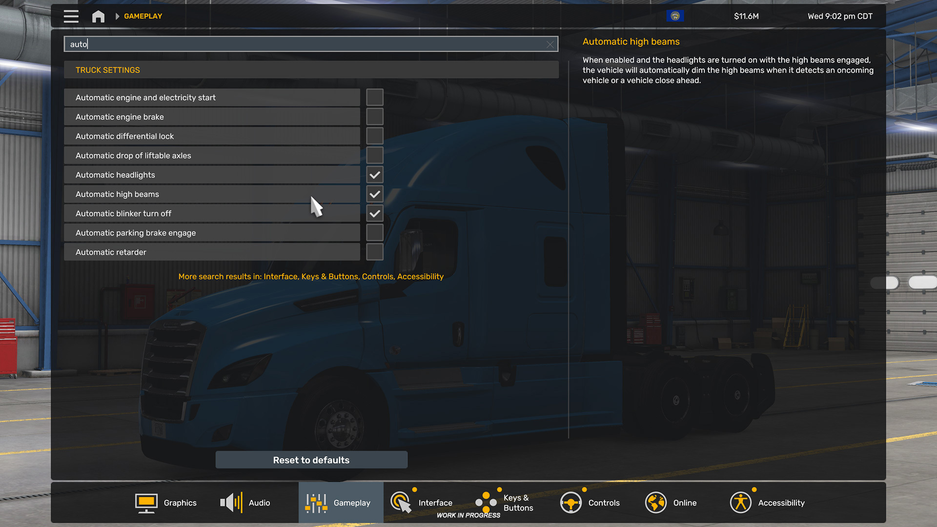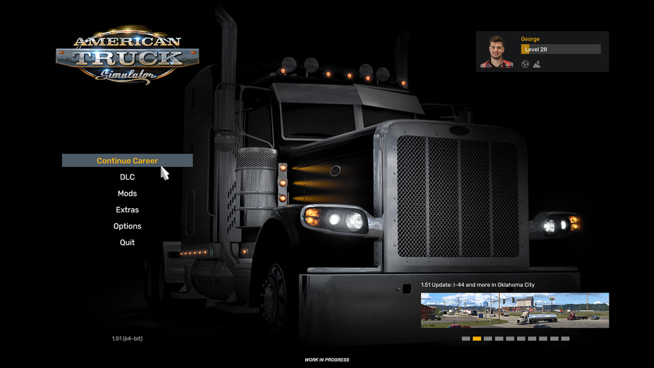 Переработали главный экран — теперь игрокам в симулятор водителя-дальнобойщика American Truck Simulator будет легче работать с ним, в том числе и при использовании для управления рулей и геймпадов. Авторы руководствовались тем же стилем, что и при переделке другого игрового меню — оно простое в навигации и понятное, в центре экрана располагается грузовик.