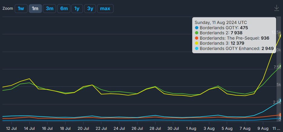 На графике SteamDB можно заметить, что наибольший прирост аудитории приходится на номерные части — Borderlands 2 и 3, у первой части (GOTY) и The Pre-Sequel прирост не такой внушительный.