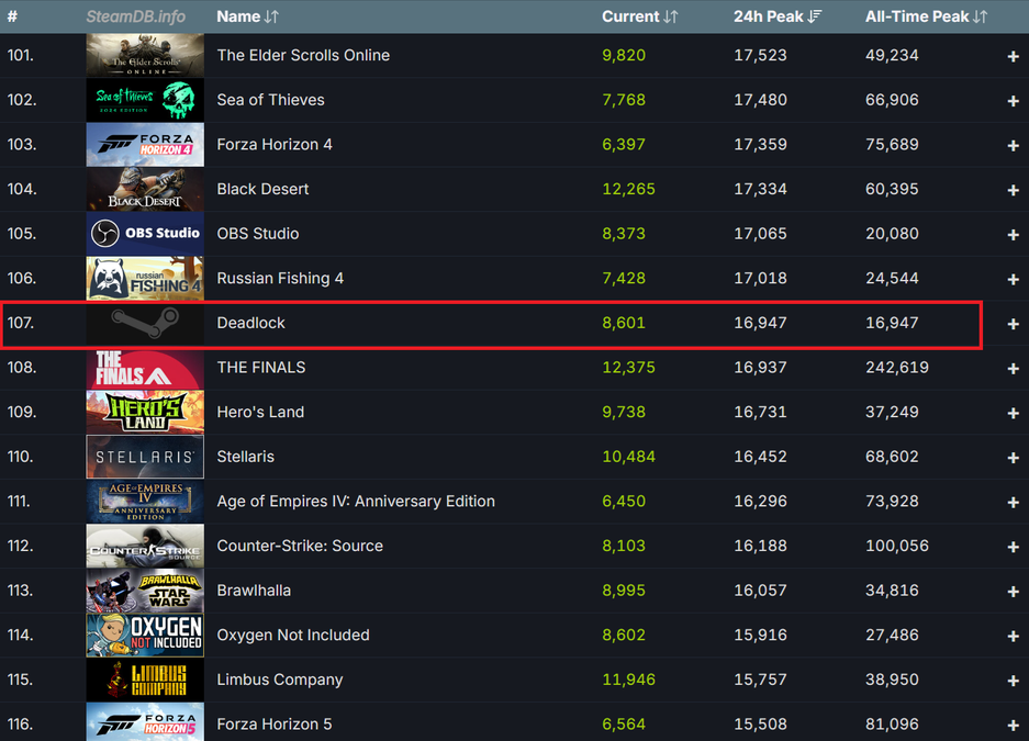 На выходных пиковый онлайн Deadlock в Steam достиг отметки в 16 947, что стало абсолютным рекордом для проекта. По данному показателю она стоит рядом с известным проектом Russian Fishing 4 (суточный пик 17 018) и обходит некогда нашумевшую THE FINALS (16 937).