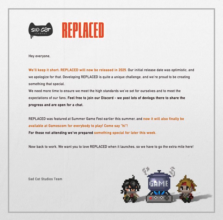 Дело в том, что разработчики Replaced объявили о переносе даты релиза на 2025 год. Они признали, что первоначальная дата была слишком «оптимистичной». Творцам требуется дополнительное время, чтобы соответствовать тем стандартам, которые они сами для себя установили. Они намерены в дальнейшем делиться материалами о разработке в собственном Discord-канале — вступить в него можно по следующему приглашению: https://discord.com/invite/d23gXsnwHU