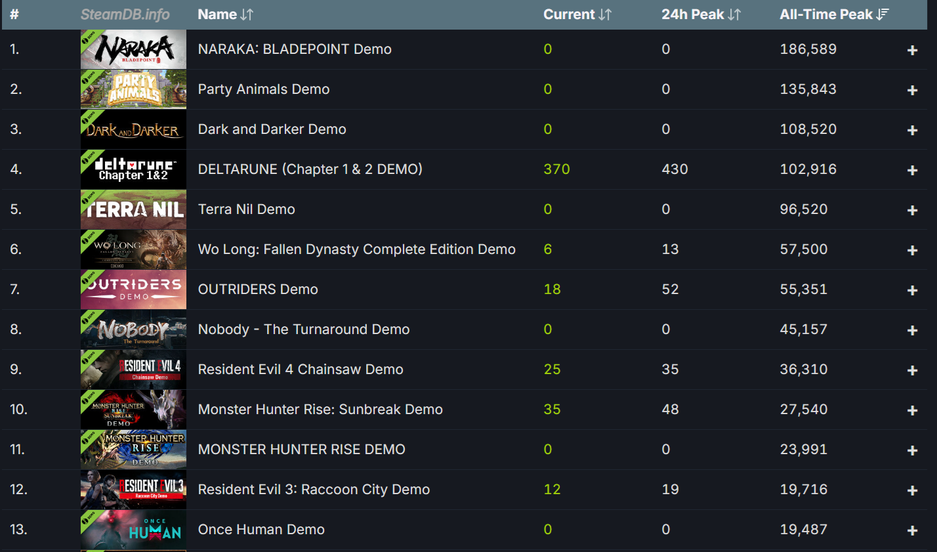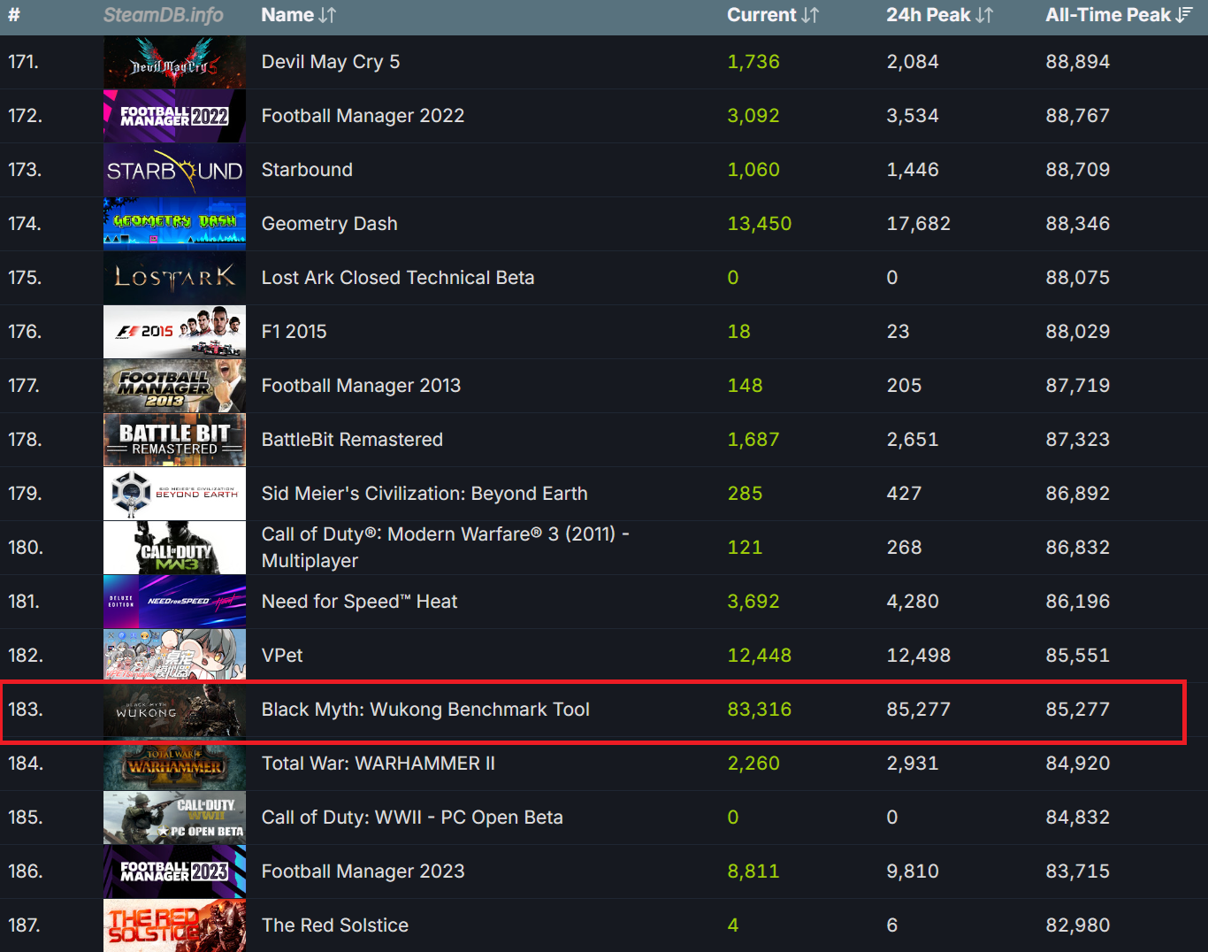 Если приравнять данный бенчмарк к демке (что не очень корректно), то Black Myth Wukong Benchmark Tool могла бы оказаться в топ-10 между Terra Nil Demo с 96 520 игроками и Wo Long: Fallen Dynasty Complete Edition Demo с 57 500 пикового онлайна.