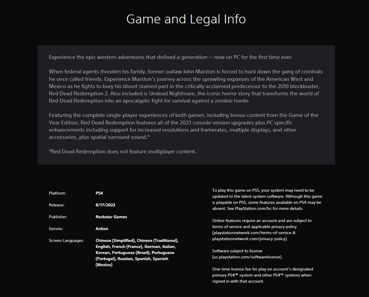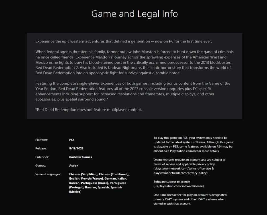 Добавление вышеприведенного описания кажется неслучайным или ошибочным. Кто-то из Rockstar Games опубликовал подробности не в том месте, в результате чего информация о Red Dead Redemption на ПК также добавлена на вкладку цифрового магазина PlayStation.