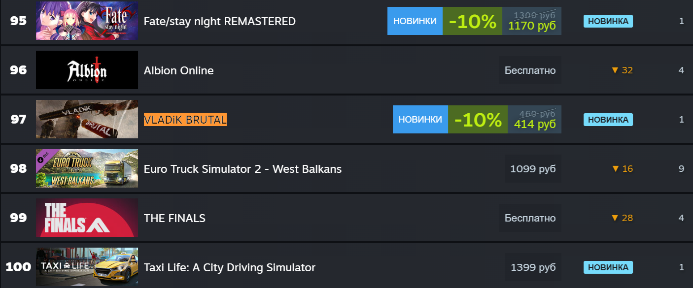Valve опубликовала статистику продаж и оказалось, что VLADiK BRUTAL стала одной из самых прибыльных игр в Турции, попала в топ-100 проектов по выручке в Steam за период с 6 по 13 августа — игра на 97 месте между Albion Online и дополнением Euro Truck Simulator 2 - West Balkans.