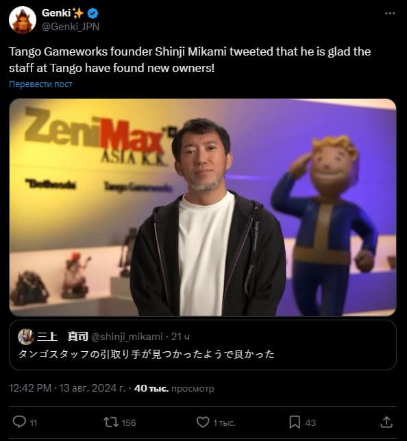 Основатель студии Синдзи Миками, создатель культовой серии Resident Evil, выразил в сети X радость по поводу того, что на его бывшую команду нашелся покупатель.