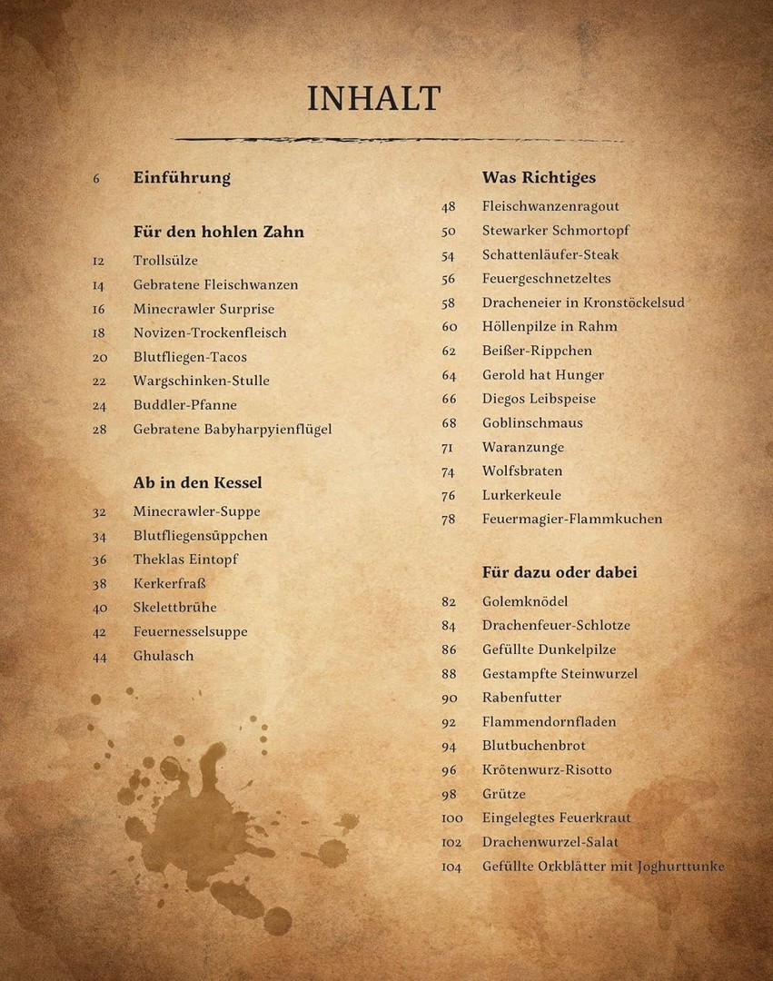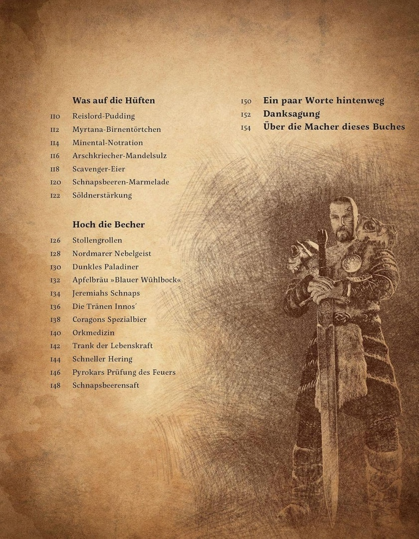 Будь то классические блюда, такие как "Рагу из мясного жука", упомянутое выше, "Грохотун", "Стюваркское рагу", "Маринованная огненная трава" или совершенно новые творения, такие как "Холодец из мяса тролля", "Фаршированные яйца падальщика", "Ребрышки кусаки" и "Суп из кровавой мухи" - здесь найдется блюдо на любой вкус, а рецепты созданы с учетом любого уровня кулинарного мастерства!».