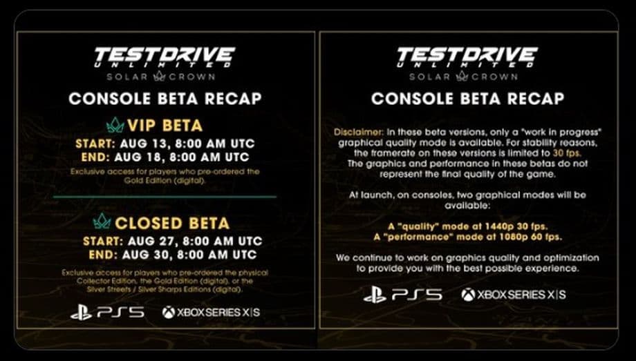 С 13 по 18 августа VIP-бету предоставят тем, кто закажет цифровое издание Gold Edition, а с 27 по 30 августа все игроки, заказавшие Test Drive Unlimited: Solar Crown (физические и цифровые версии), примут участие во втором этапе закрытой беты.