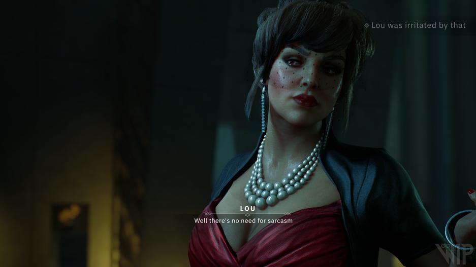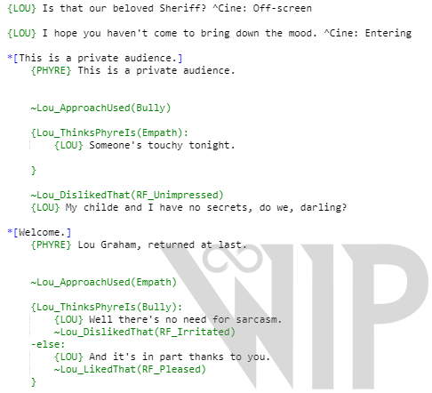 Независимо от этого, выбор этого варианта отрицательно скажется на мнении Лу о Файр — обозначенном ~Lou_DislikedThat — которое со временем может наложиться на её восприятие Файр как хулигана, эмпата или мудреца. (RF_Unimpressed) представляет собой природу её недовольства, которое подпитывает пользовательский интерфейс, который увидят игроки.