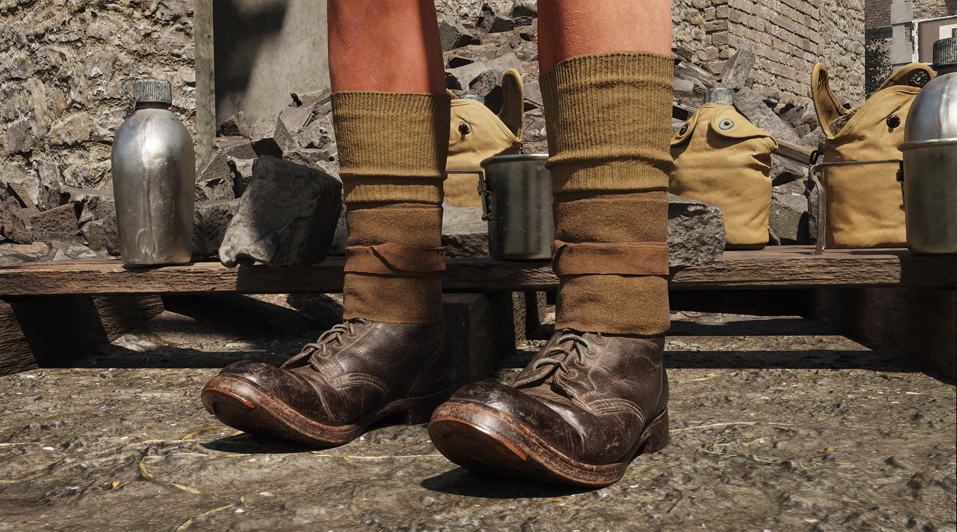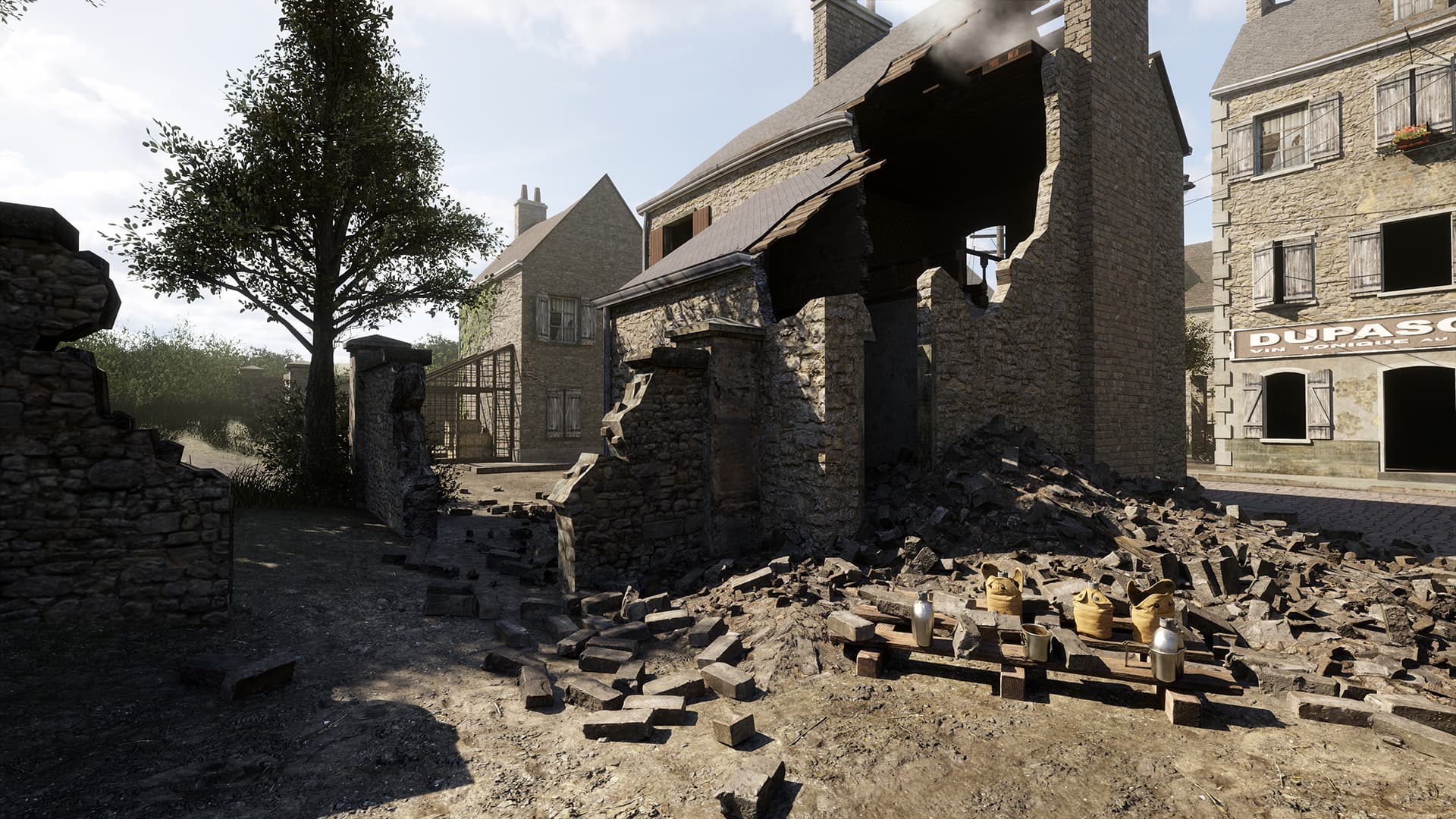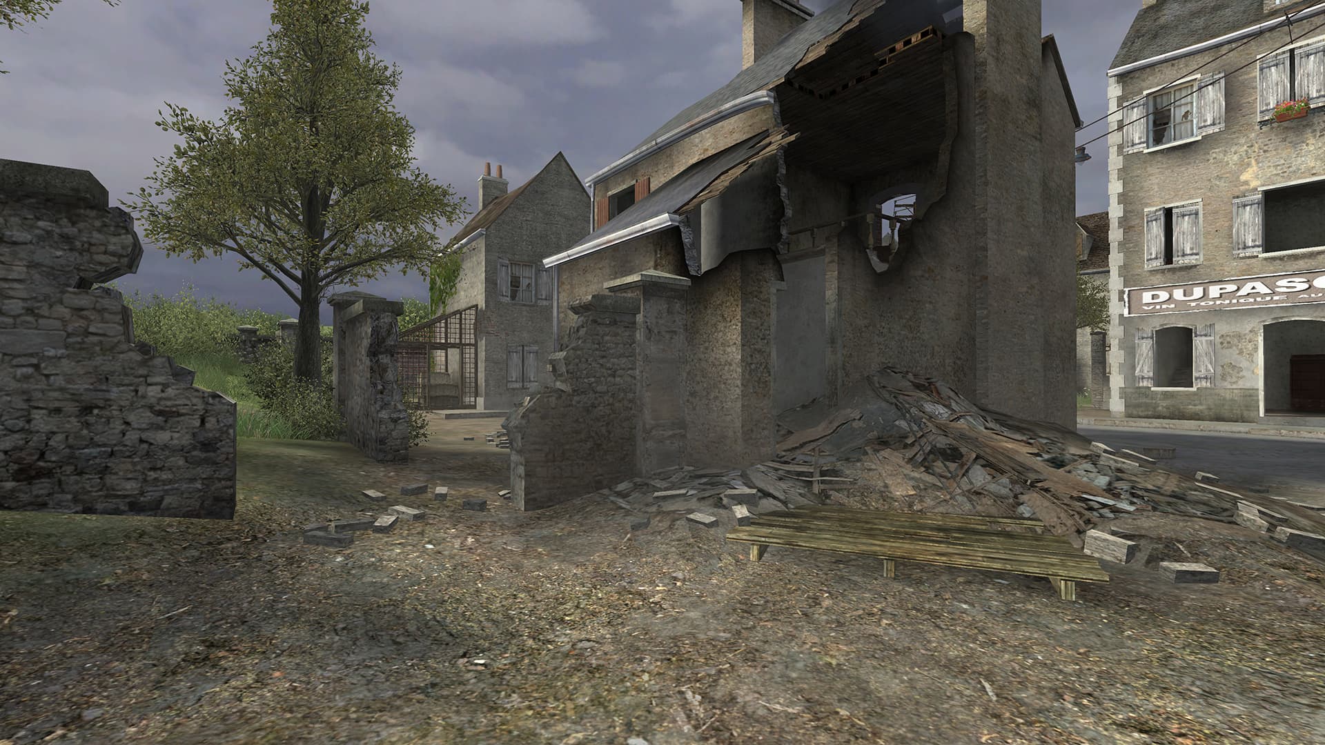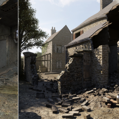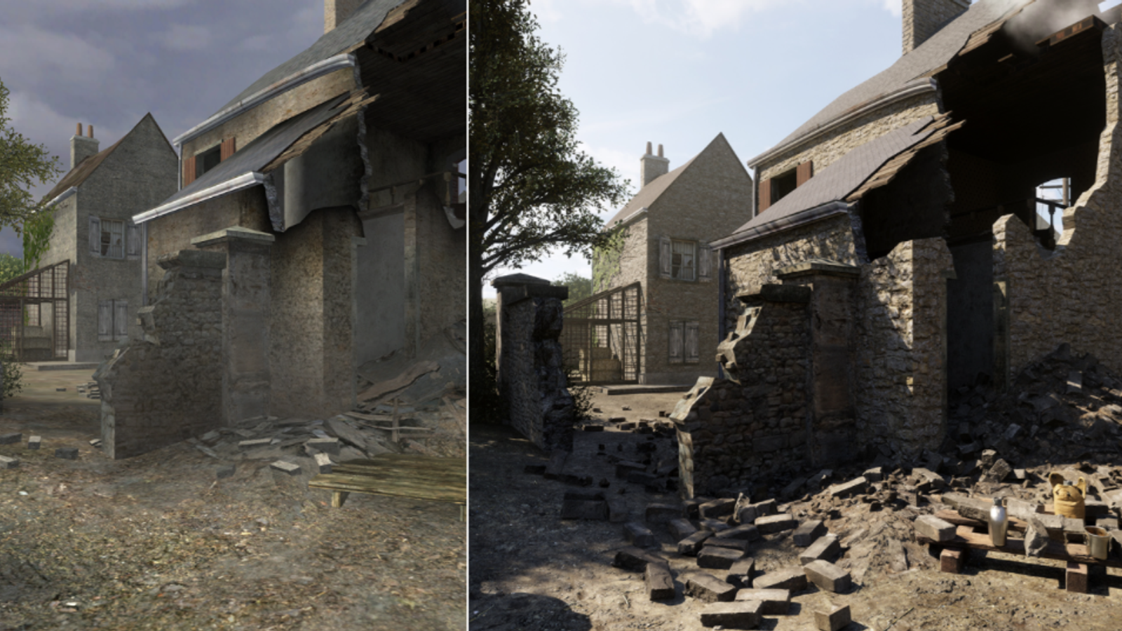 Для обновления была выбрана карта Carentan: он добавил больше деталей там, где раньше плоские угловатые текстурированные поверхности изображали мусор (доски на первом кадре ниже) и цикл день-ночь с динамическим освещением (за него отвечает солнце-луна, лампы и фонари); поверхности переделаны так, чтобы могли реагировать свет, а вода будет отражать окружающую среду.