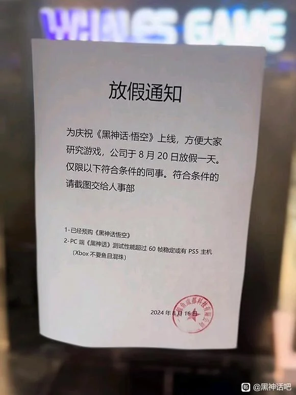 В сообществе Black Myth Wukong начали распространять следующее фото. Как заявляется, работники китайской компании могут рассчитывать на выходной 20 августа в честь запуска отечественной игры, но надо соответствовать двум требованиям:
