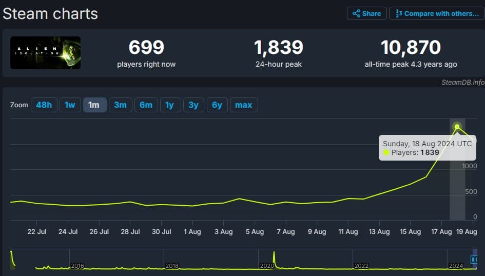 Судя по данным Steam Charts, в минувшие выходные в Alien: Isolation наблюдался огромный скачок числа игроков. На пике популярности хоррор собрала 1839 одновременных пользователей. Хотя по сравнению с другими играми это может показаться не так много, это самый активный показатель для Alien: Isolation с апреля 2020 года. До этого наивысшей отметки игра достигала летом 2015 года, то есть менее чем через год после выхода Isolation.