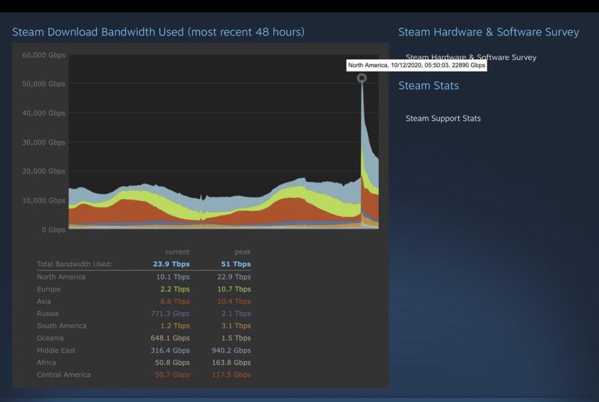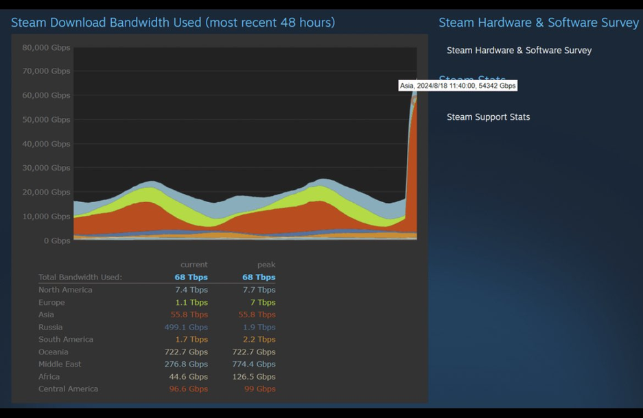 Статистика за 2024 год (всплеск совпал с запуском предзагрузок Black Myth Wukong). Зелёным цветом обозначчает Европа, оранжевым — Азия, а серо-голубым — Северную Америку. На скриншоте ниже рекорд 68 Tbps, но впоследствии он был обновлён до 70 Tbps.