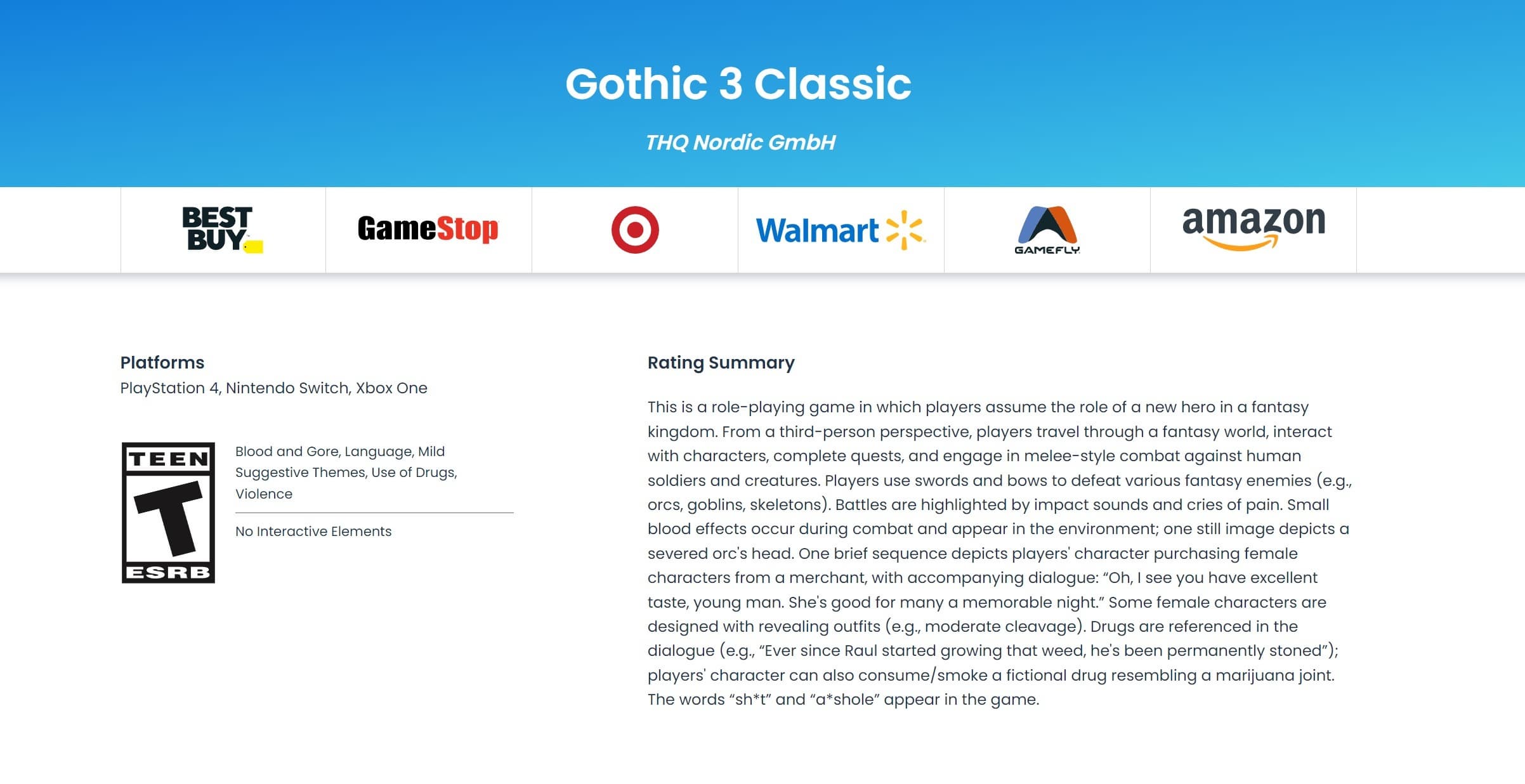 Многие помнят порты Gothic, которые выходили на консолях Nintendo Switch. Обе части обошли стороной PlayStation и Xbox, но с третьей частью всё будет иначе. На сайте ESRB появилось описание игры, а также целевые платформы.