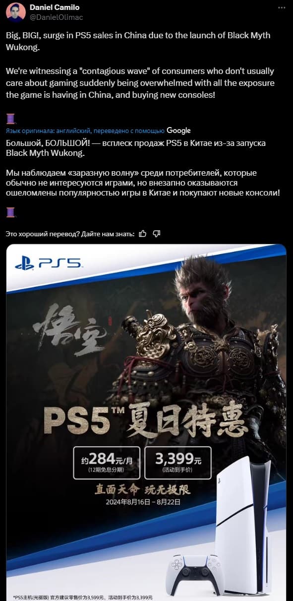Ситуация прекрасно демонстрирует с насколько масштабным запуском столкнулась игра и как много китайских геймеров бросились покупать один из крупнейших релизов года. Многие, чтобы поиграть, даже готовы купить консоль PS5. Только PS5, так как Black Myth: Wukong до сих пор нет на Xbox.