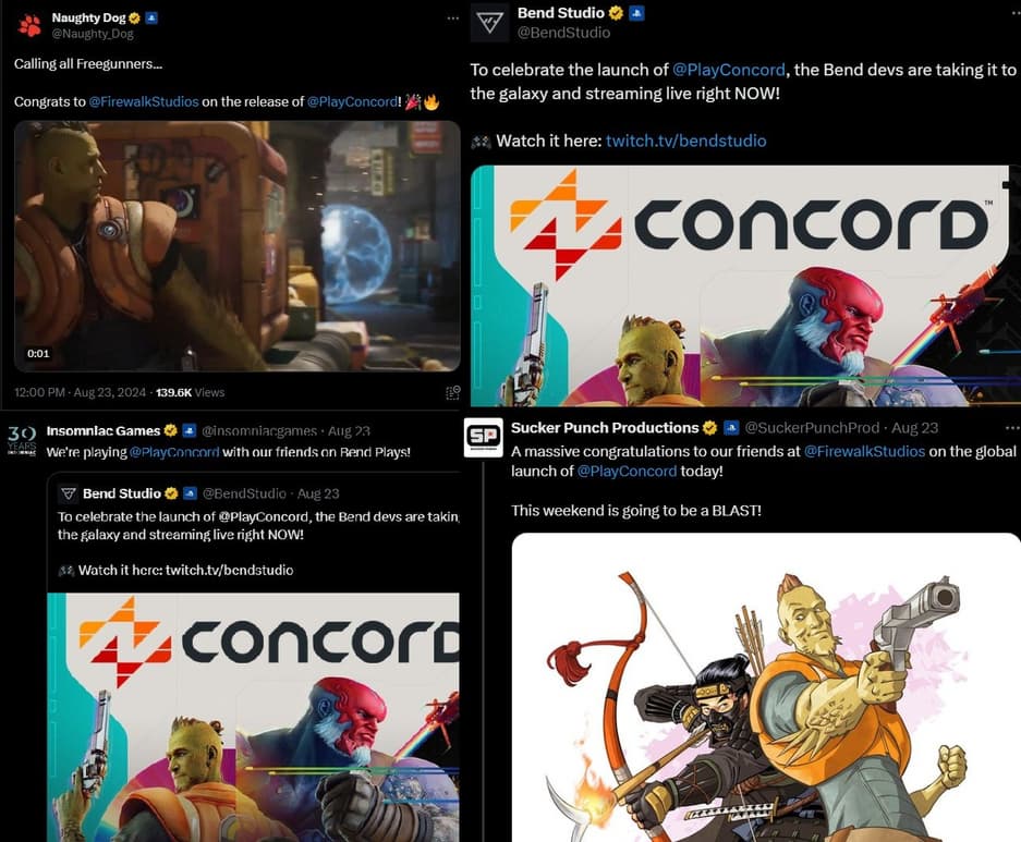 После выхода Concord ряд студий, входящих в инициативу PlayStation Studios, опубликовали на платформе X сообщение о том, что сотрудники таких команд, как Naughty Dog (The Last of Us), Bend Studio (Days Gone), Insomniac Games (Spider-Man) и Sucker Punch (Ghost of Tsushima), проведут минувшие выходные в последнем релизе Sony.