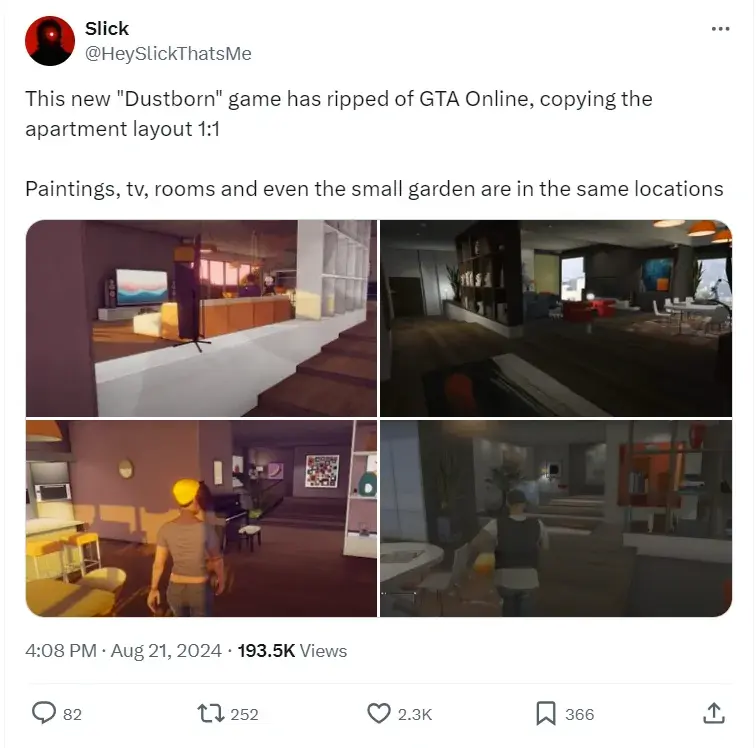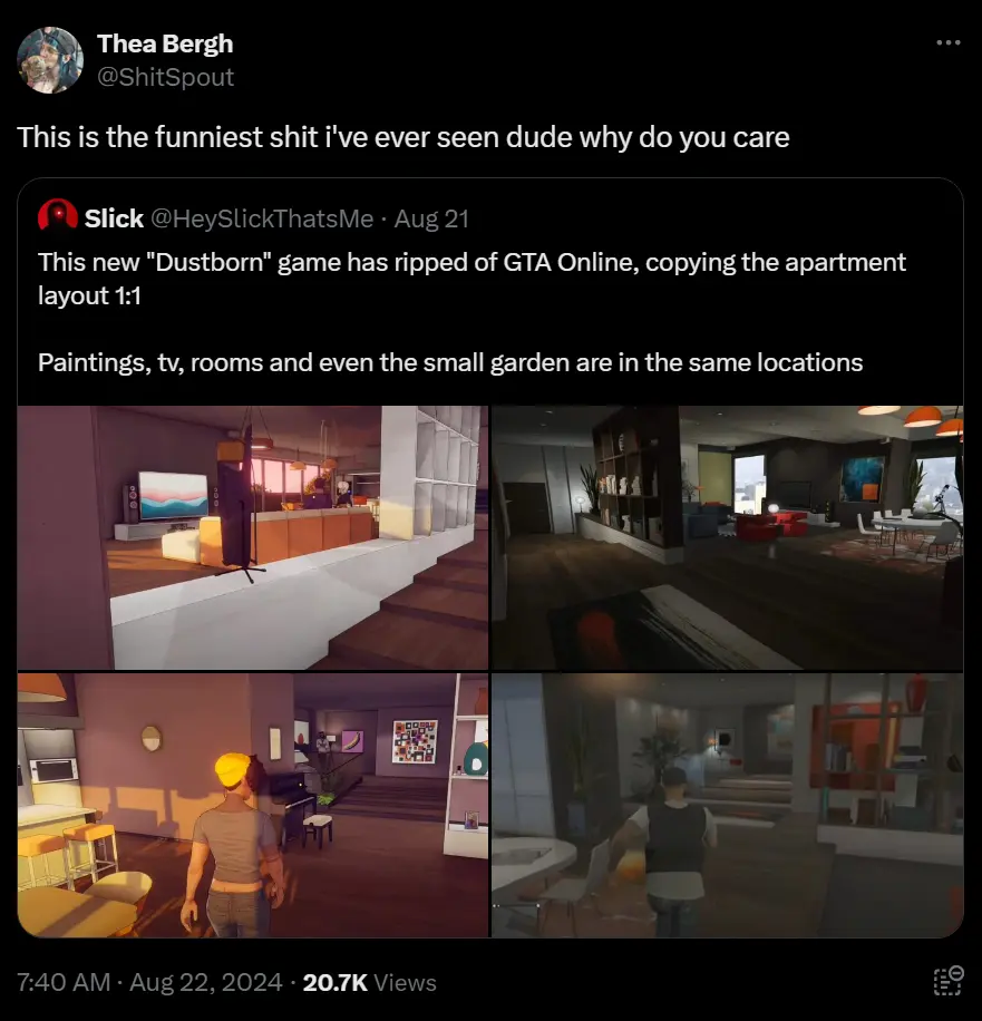 Пользователи сети обратили внимание на то, что авторы собранного буквально из повестки и прогрессивных идей проекта Dustburn полностью скопировали интерьер из Grand Theft Auto Online; картины, телевизор, комнаты и небольшой огород — все было срисовано 1 в 1.
