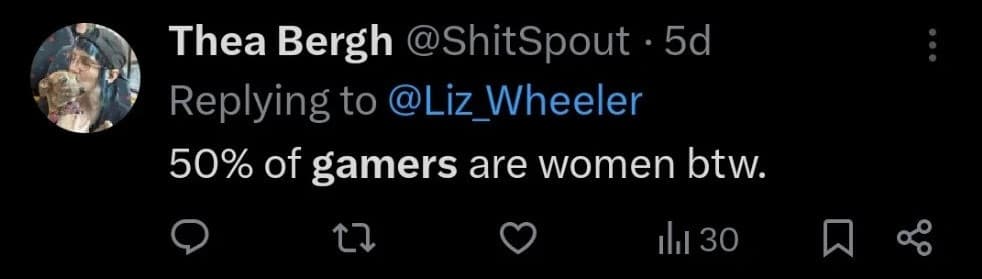 Теа Берг назвала мужчин «слабым звеном» и заявила, что 50% геймеров являются женщинами. Источник статистики Берг не стала называть.