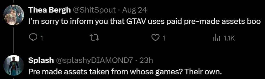 «Это дико смешно, чувак. Твое какое дело. Жаль сообщать, но GTA 5 также использует готовые ассеты. Поплачь еще».