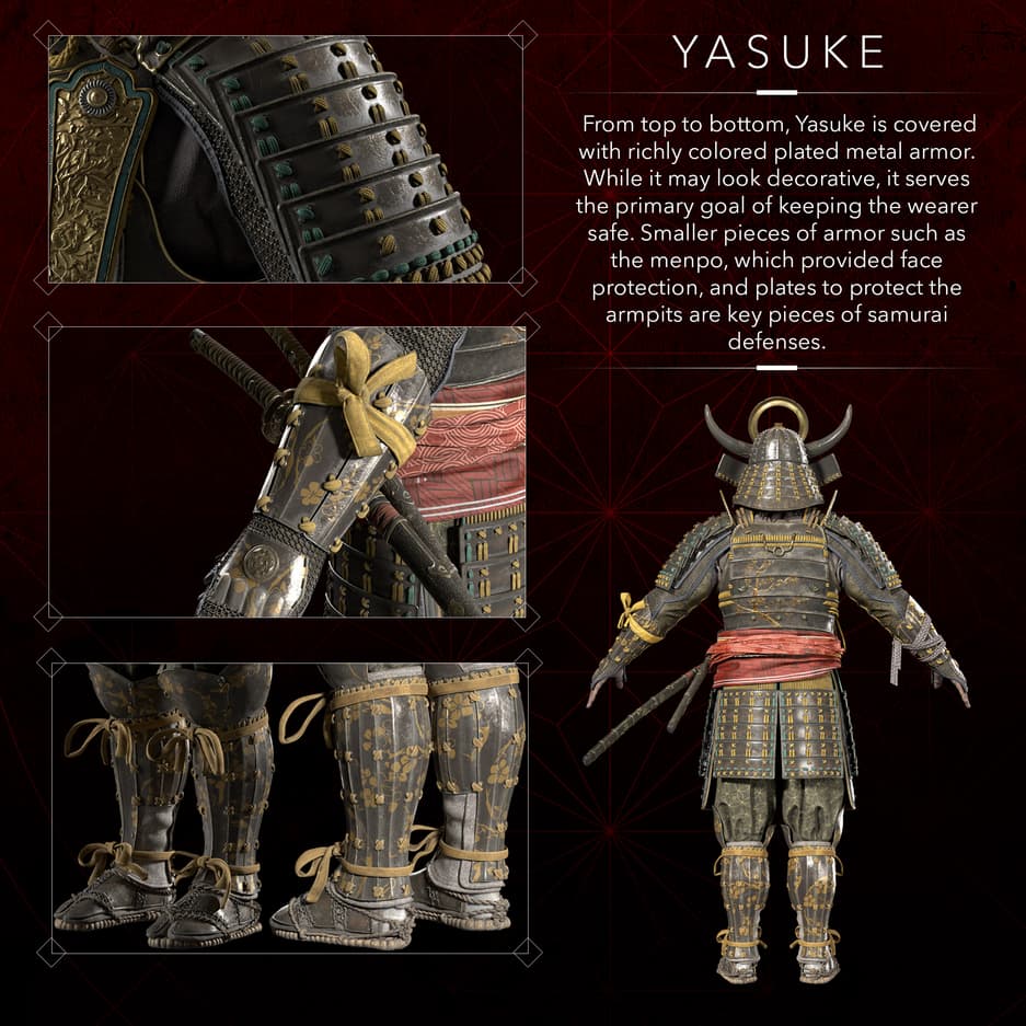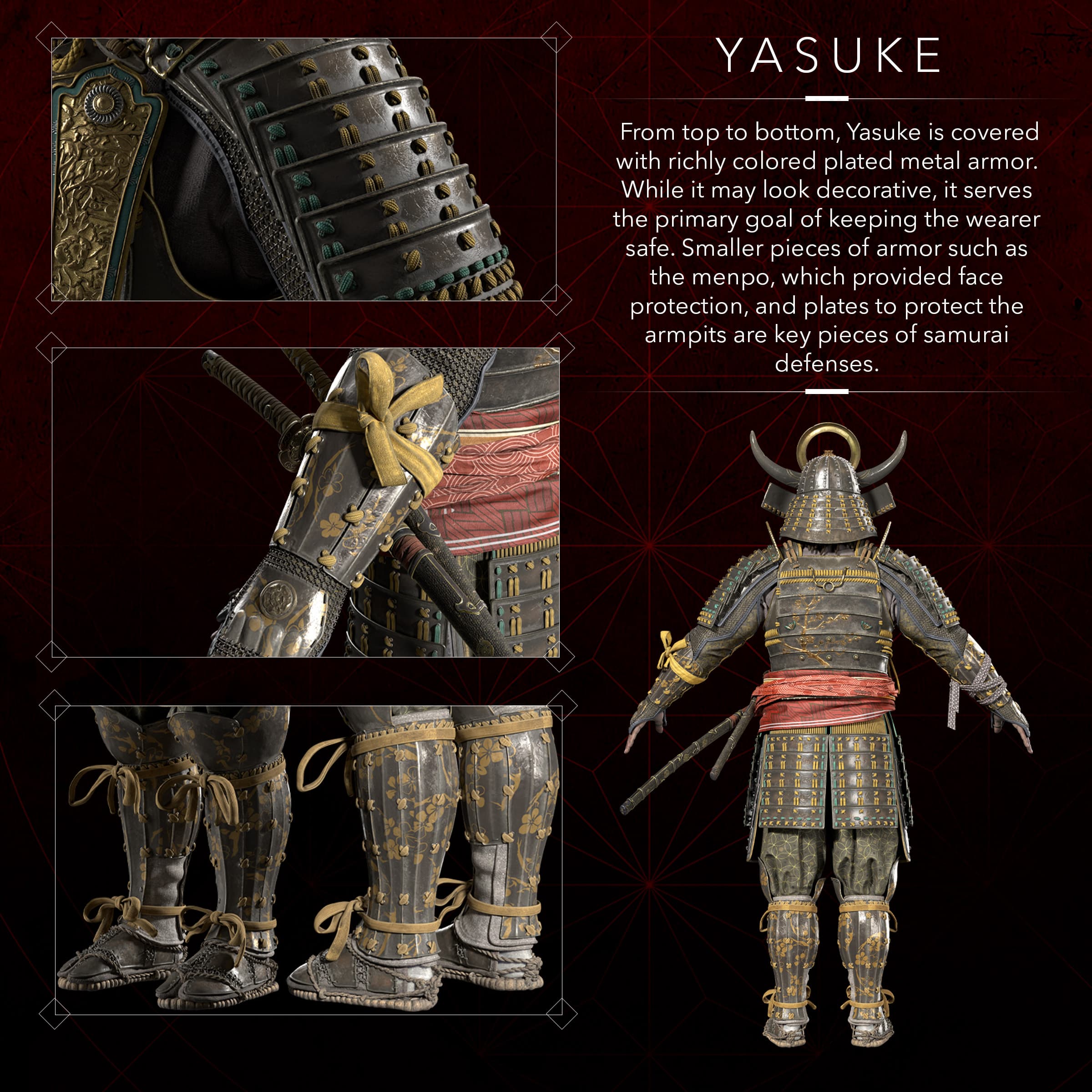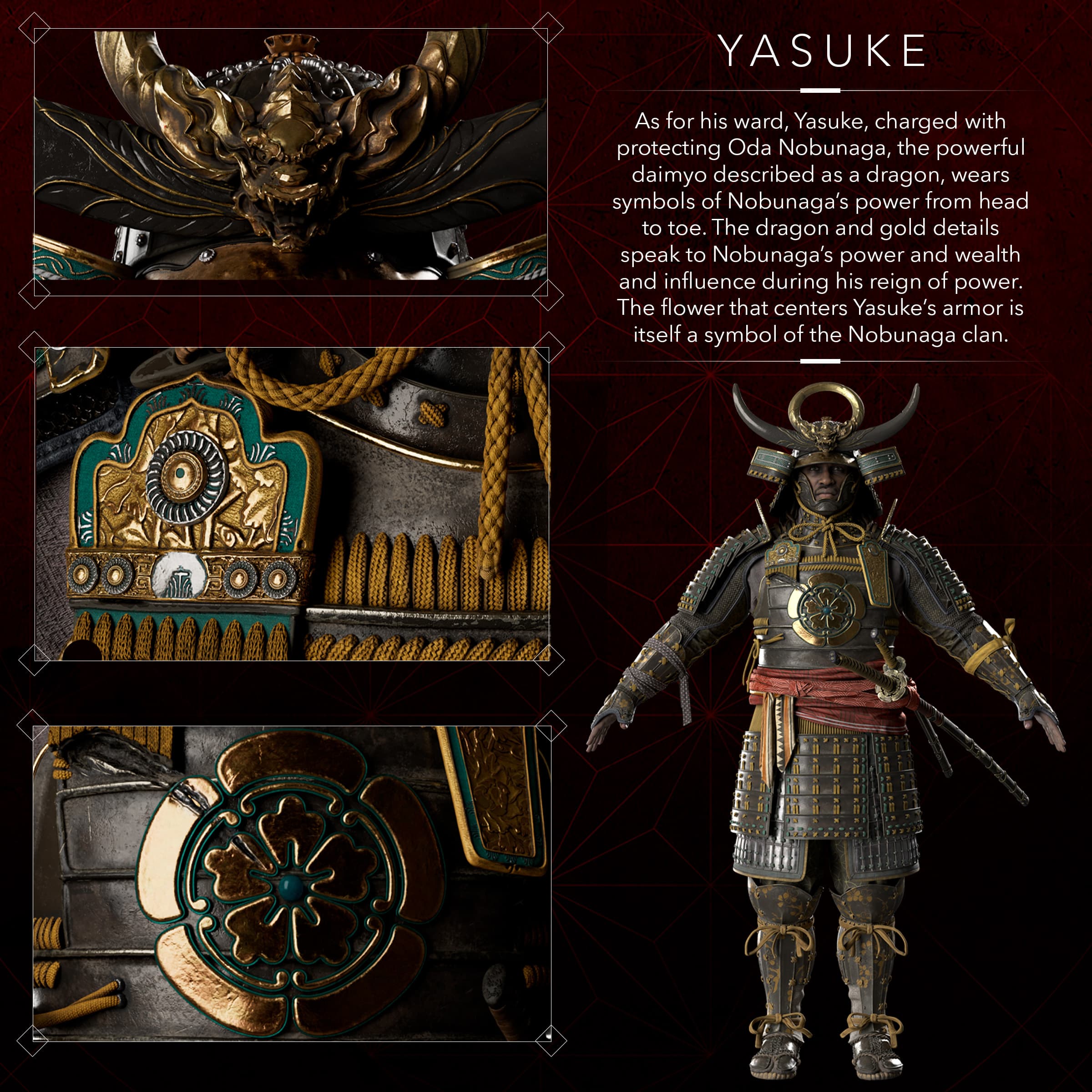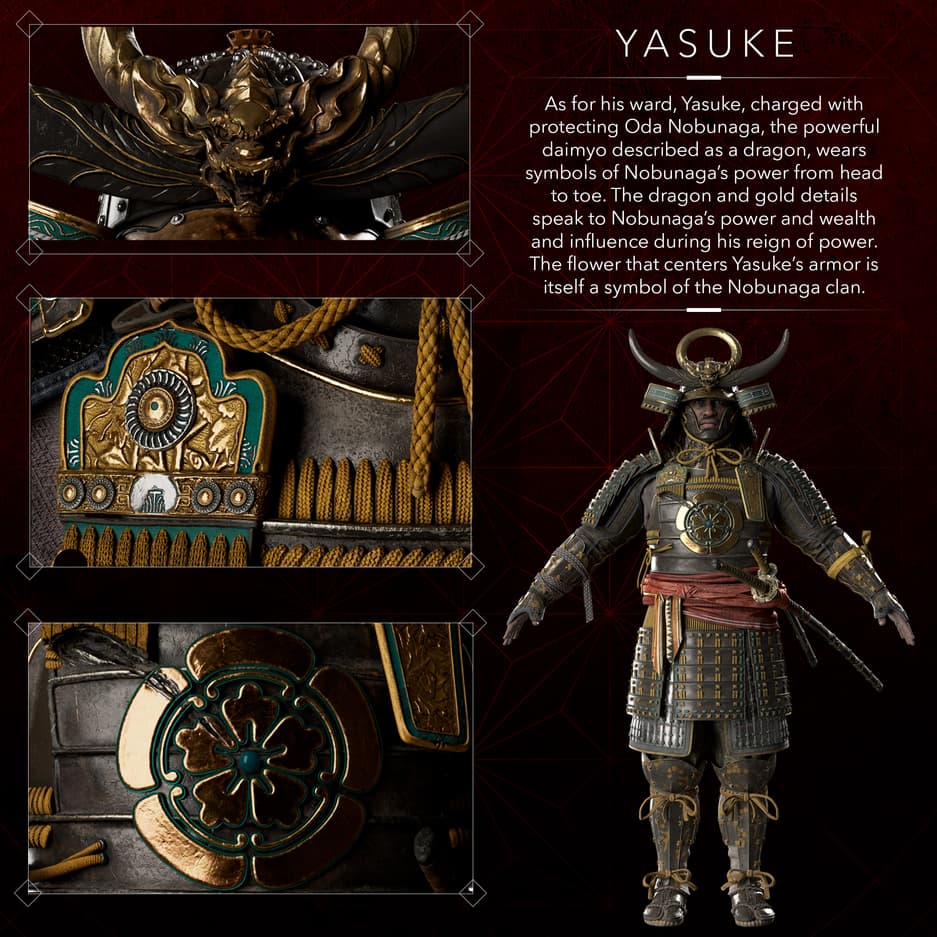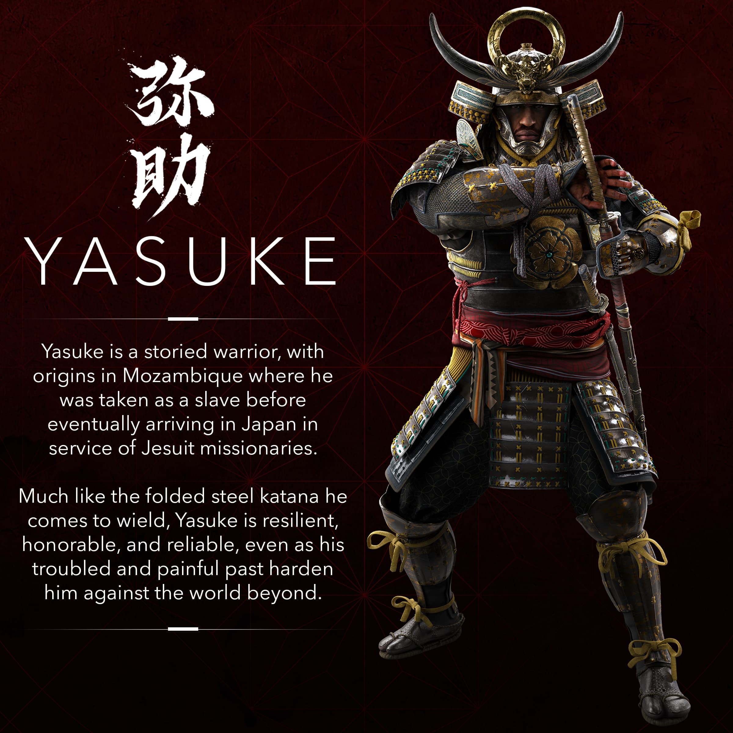 Теперь есть возможность рассмотреть модель Ясукэ со всех сторон. В мире игры у персонажа следующая история: Ясукэ прибыл в Японию из Мозамбика. Перед прибытием в страну его сделали рабом и в Японии он появился вместе с миссионерами. Пока не ясно, как же протагонист смог стать самураем, но отметили, что его доспехи выполнены в стиле Оды Нобунаги.