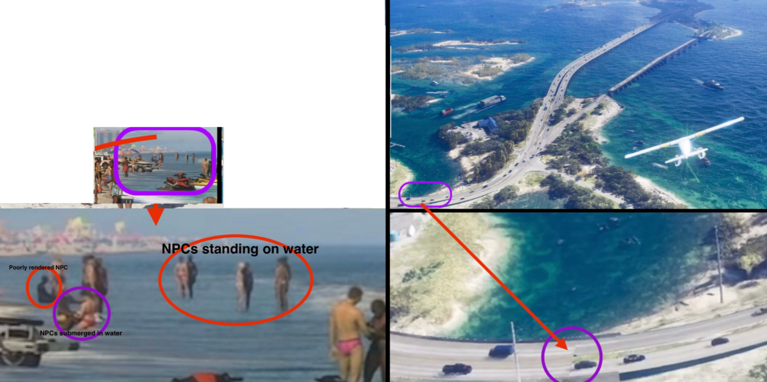 Плохо прорисованные NPC и другие NPC вдали, стоящие на воде || Плохо прорисованная дорога.