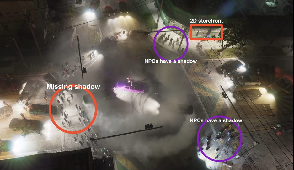 Отсутствие тени NPC с левой стороны и 2D-витрина магазина — кажется, что не войти (фиолетовый круг — есть тень, красный круг — нет).
