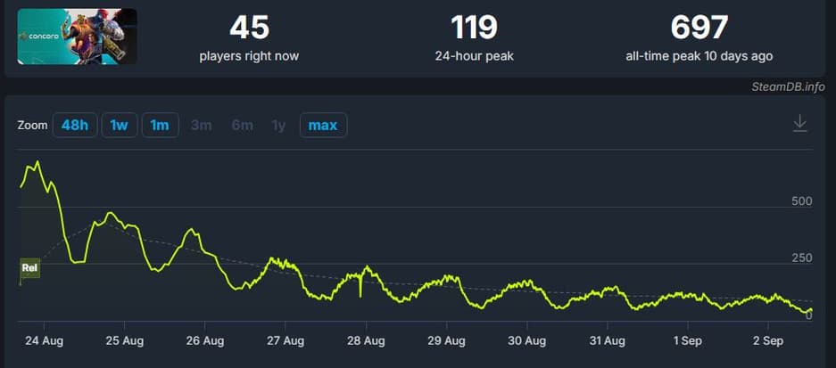 Concord продолжает тонуть в забвении: онлайн мега-прогрессивного шутера с героями, у которых местоимения в профилях, рухнул до 45 человек на персональных компьютерах. Учитывая, что для старта матча в лобби должно набраться 10 человек, то во всем мире на ПК сейчас проходят четыре сессии, а пять человек просто ждут, пока они закончатся.