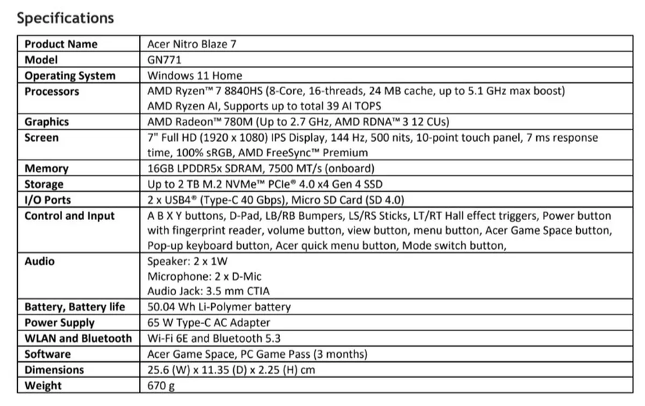 Некоторые другие характеристики Acer Nitro Blaze 7:
