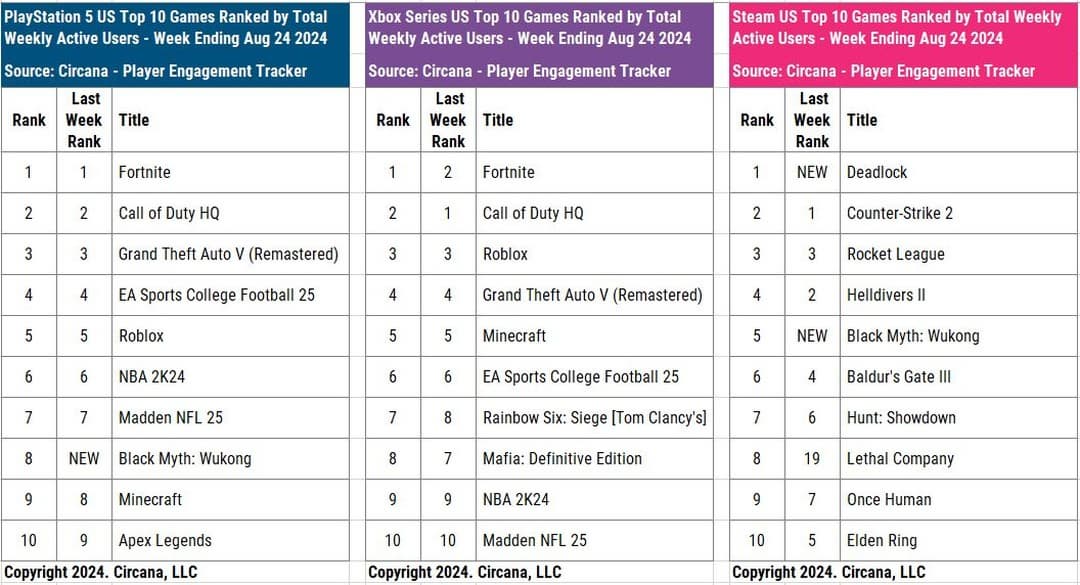 По словам руководителя Мэта Пискателлы в социальной сети Threads, Black Myth: Wukong стала 8-й по популярности игой для PlayStation 5 в США, единственной новой в списке за неделю, закончившуюся 24 августа. В список попали спортивные игры, GTA 5, условно-бесплатные проекты, а также игра Game Science.