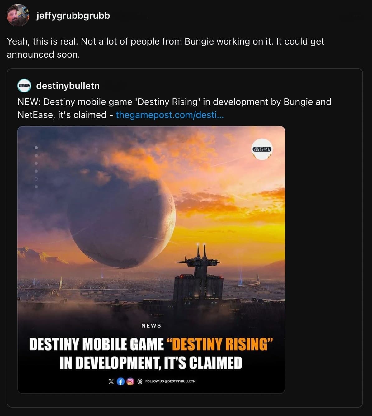 Но, не исключено, что Sony анонсирует игру для мобильных устройств, действие которой разворачивается во вселенной Destiny. По мере того как в сети появлялись сообщения о дальнейших шагах Bungie, журналист Джефф Грабб подтвердил, что вскоре может состояться анонс Destiny Rising - игры для мобильных устройств. Она будет значительно отличаться от оригинала, в том числе наличием набора готовых героев.