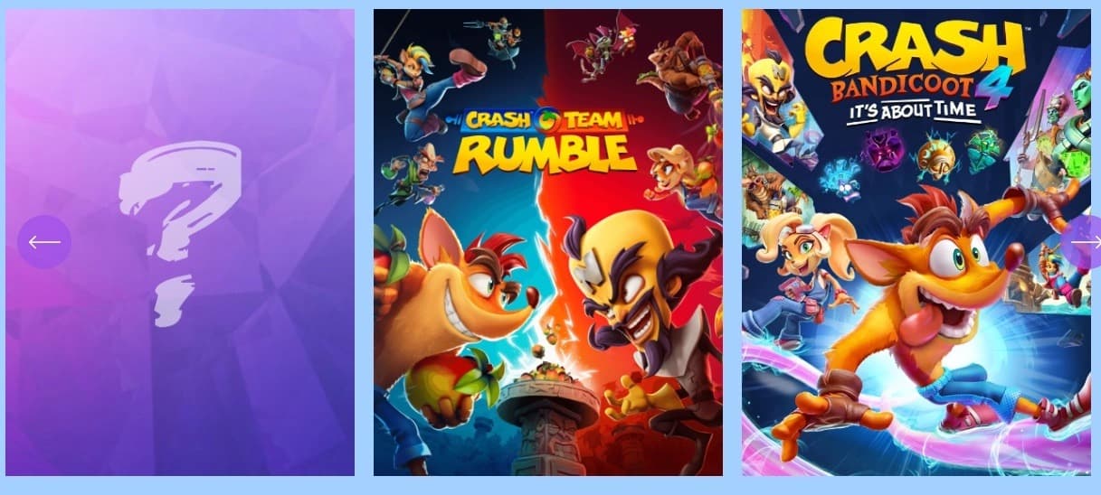 На портале компании можно найти информацию о свежих играх. На данный момент там три рубрики. В двух первых изображены обложки игр серии Crash Bandiicoot, а в третьей - знак вопроса на фиолетовом фоне, который явно ассоциируется с дружелюбным драконом.