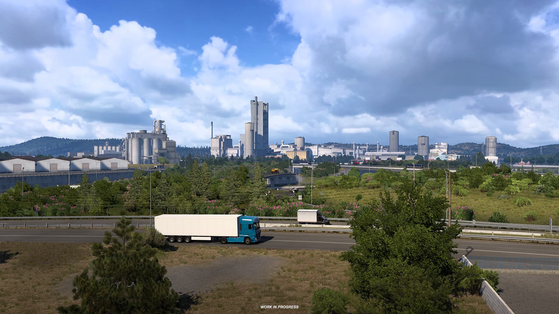 На этот раз в центре внимания оказался цементный завод в Салониках, втором по величине городе Греции. Завод был построен в 1962 году и играет важную роль в местной экономике, обеспечивая сотни рабочих мест. Это довольно большой завод, поэтому при доставке грузов в Euro Truck Simulator 2 можно будет увидеть его издалека из разных точек дорожной сети.