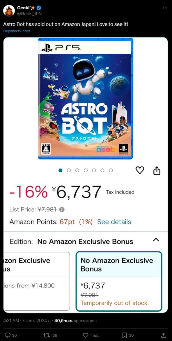 Как сообщил информатор Genki_JPN, на Amazon Japan игра не только стала бестселлером №1, но и отсутствует на складах, так как полностью распродана. Поскольку Astro Bot только вышла, Sony ещё не предоставила подробную информацию о продажах, но это надёжный показатель успешного старта в Японии. Будет ли игра продаваться так же в других странах, ещё предстоит выяснить, но широкое признание изданий и сарафанное радио говорят о том, что это возможно.